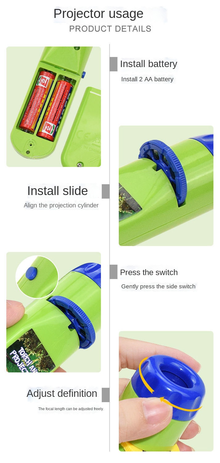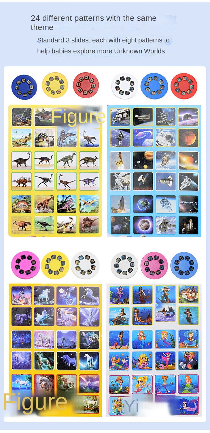 【Легко использовать 】для замены слайда, просто потяните открыть пластиковую крышку, вставьте выбранный диск, поверните или Отрегулируйте диск и наблюдайте за проецируемым изображением; И размер очень подходит детям для захвата и переноски, и может использоваться в качестве фонарика, Чтобы дети могли весело провести время в ночное время чувство безопасности! Вы можете повернуть переднюю линзу, чтобы настроить четкость изображения, и перед вами будут представлены различные фотографии