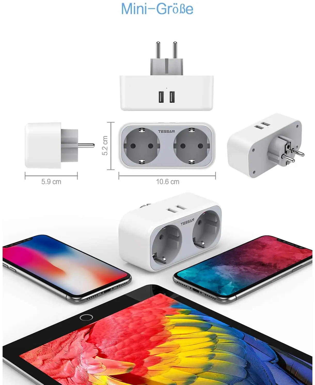 the TESSAN USB socket adapter is suitable for connection to standard European earthing contact sockets (diameter 4.8mm). Simply plug it into any surface-mounted USB socket and you will receive an extension to 1 Schuko socket and double USB plug to avoid plugging in multiple USB chargers. Multiple socket without cable saves space and keeps your desktop tidy.
