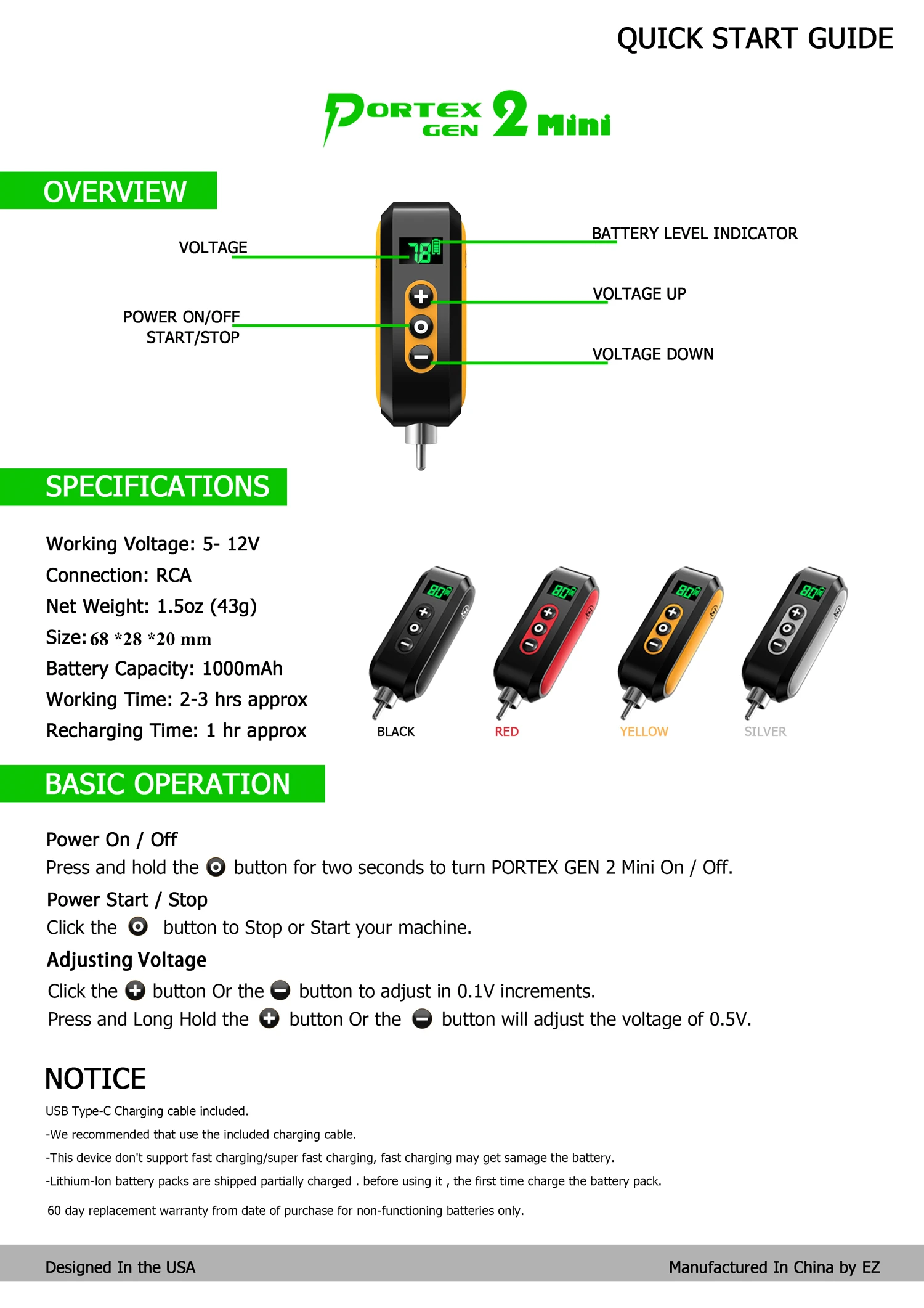 С временем зарядки 2 часа, он может работать до 4 часов. В зависимости от личного использования и тату-машины.
