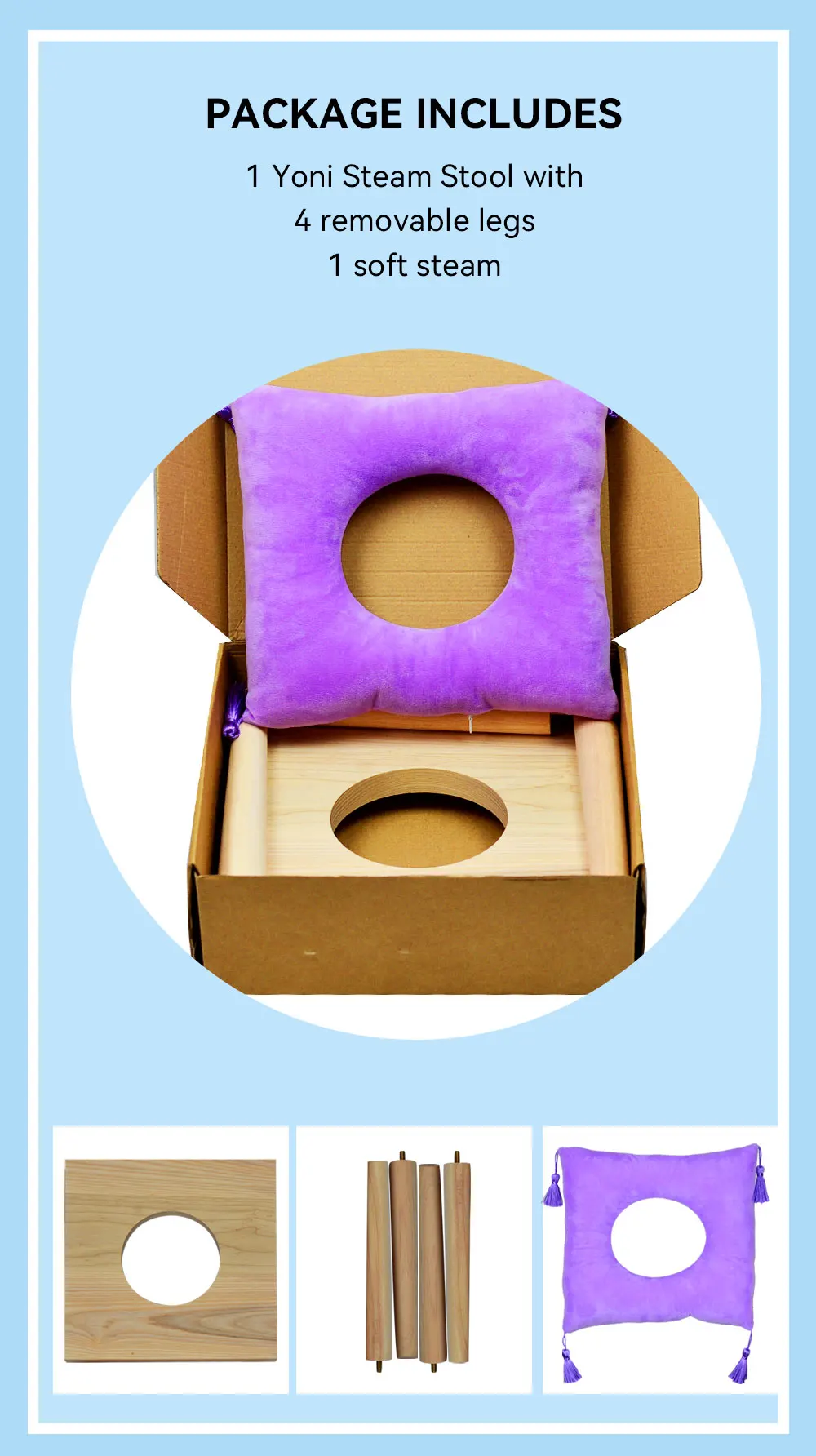 Посылка включает в себя: 1 паровой стул Yoni с 4 съемными ножками и 1 мягкой паровой подушкой.