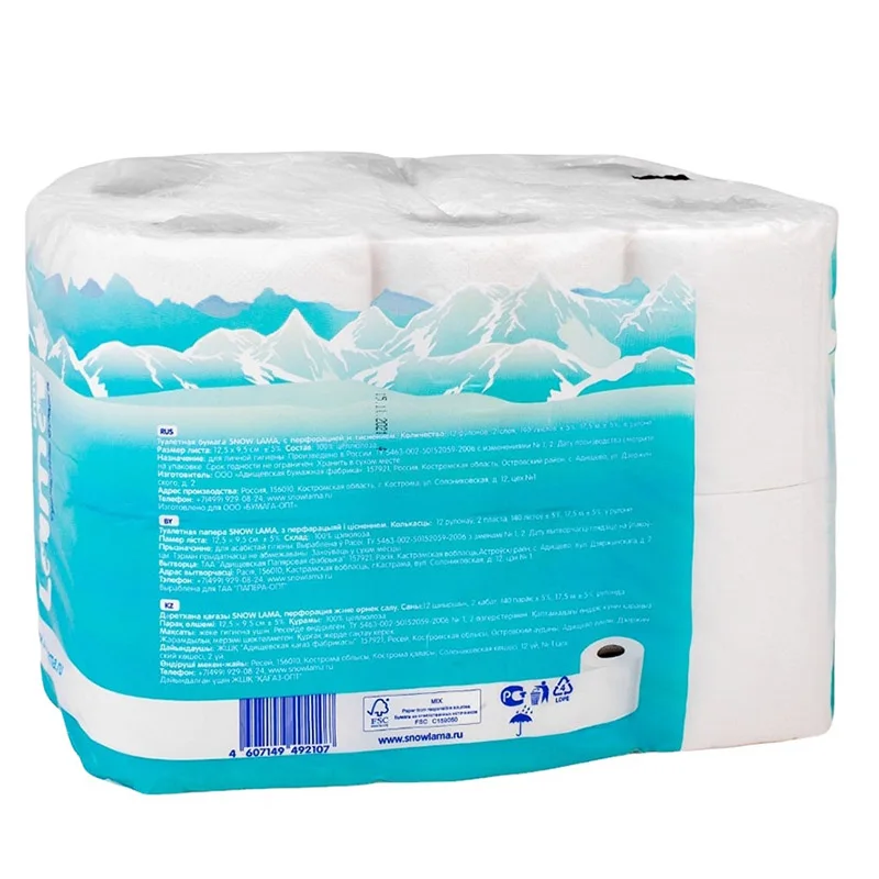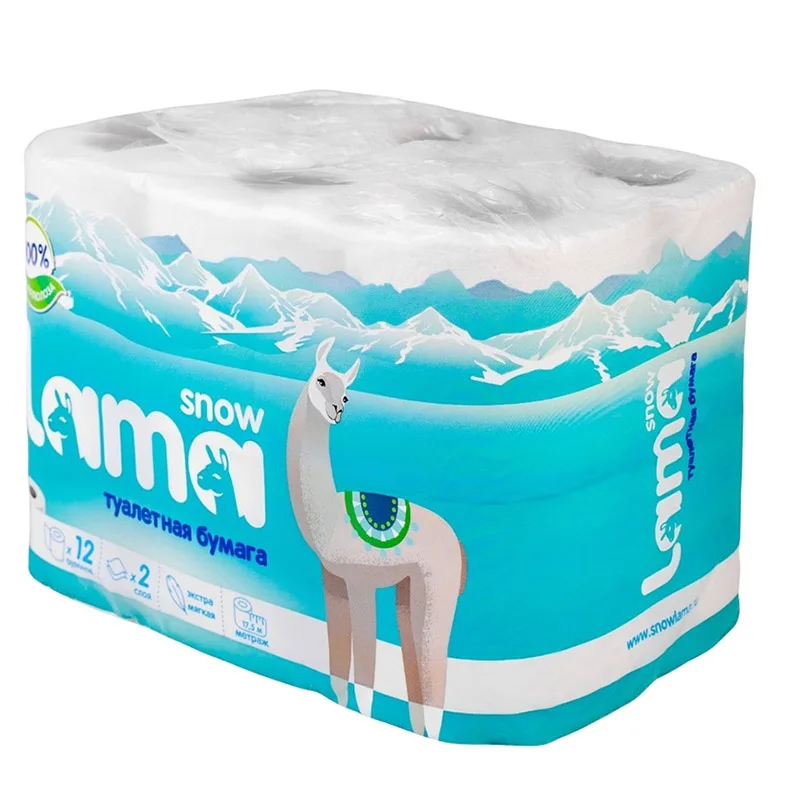 Бумага туалетная Snow Lama БЕЛАЯ 2сл. 12 рулонов. Обладает хорошим сочетанием прочности и мягкости, хорошо впитывает влагу. Состав: 100% целлюлоза. Длина рулона 17,5 м, ширина рулона 9,5 см, диаметр втулки 4,5 см.
