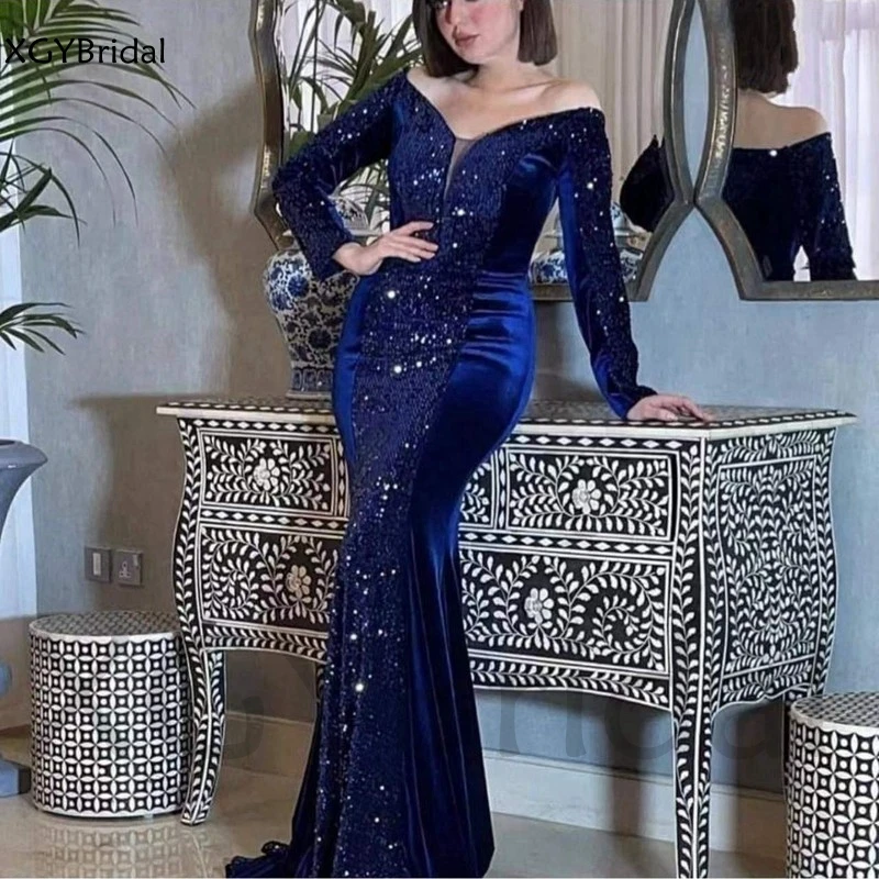 Новое поступление, вечерние платья с v-образным вырезом, Королевский синий цвет, Русалка, для женщин, Sequine, кружевное, Дубай, вечернее платье, abendkleider robe femme