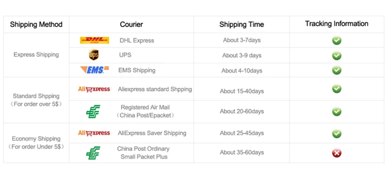 A:DHL/ UPS/ Aramex about 8-10days. Fedex about 3-5days. AliExpress Standard Shipping about 25-45days. China Post Ordinary Small Packet Plus about 45-60days.