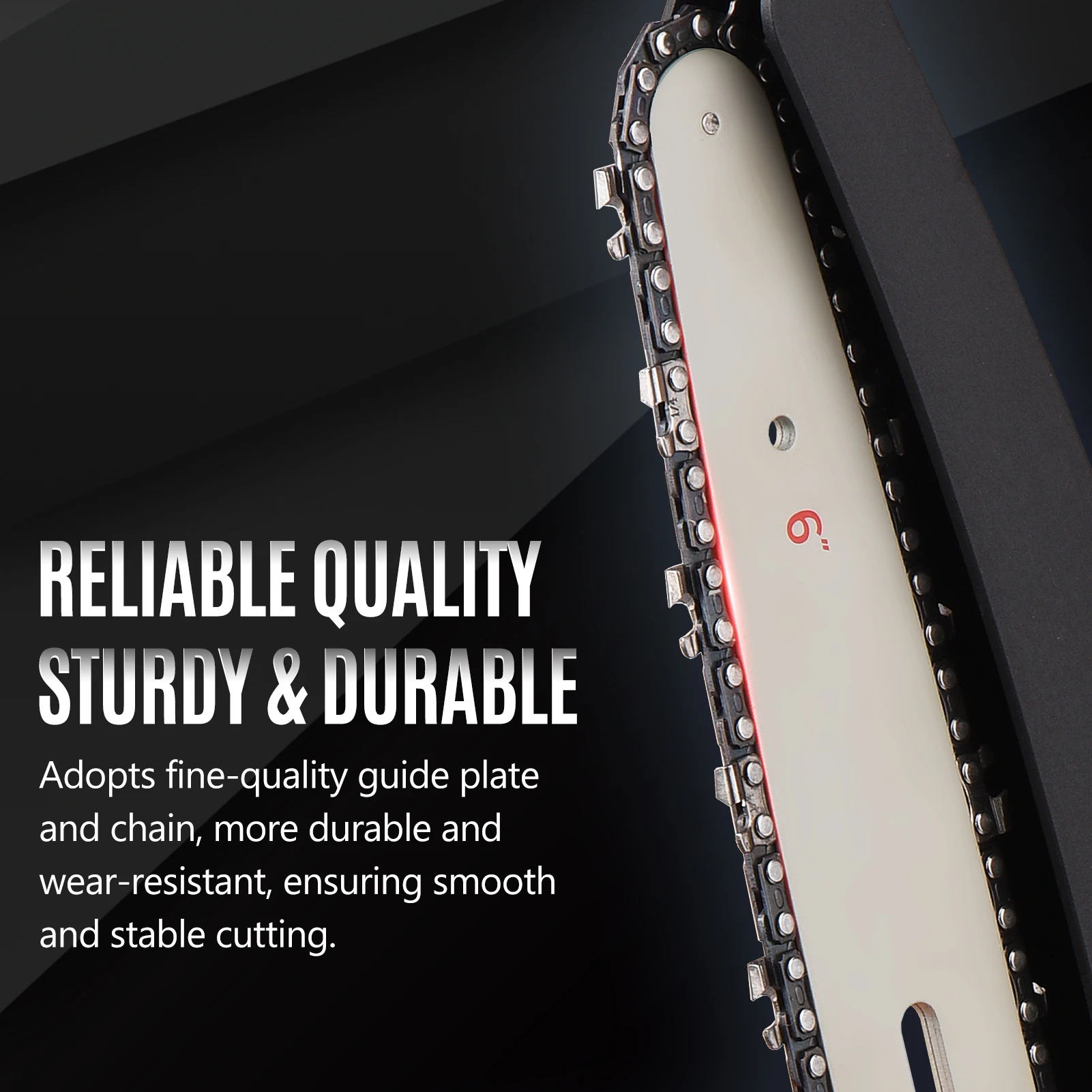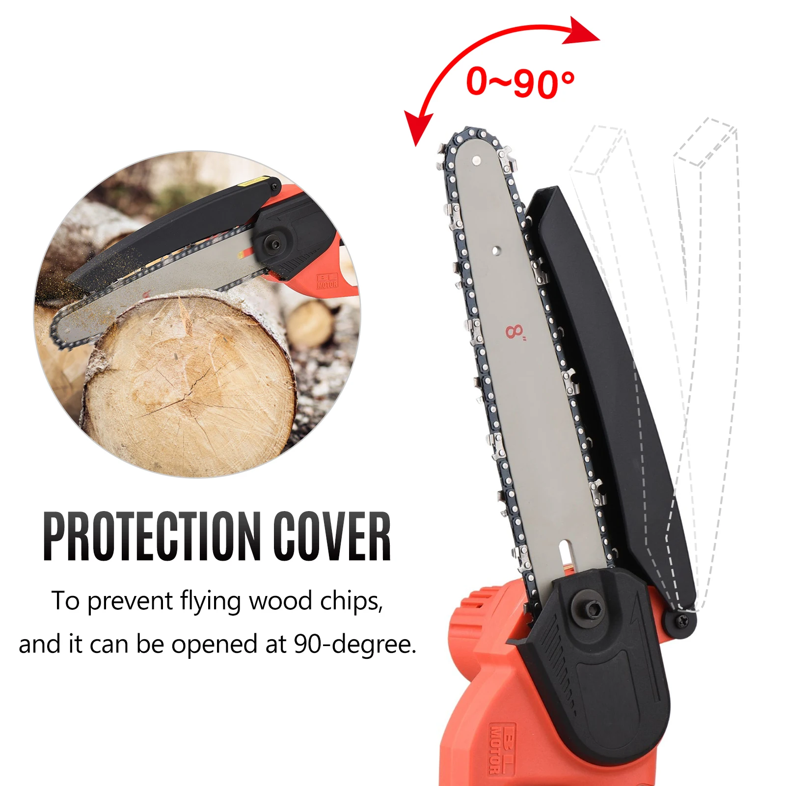 Электрическая бензопила, высокая эффективность --Принимает высококачественную направляющую пластину и цепь, более прочные и износостойкие, обеспечивая плавную и стабильную резку. С защитным покрытием, чтобы предотвратить летающие щепы, и его можно открыть на 90 градусов. Электрическая бензопила с высокой производительностью значительно экономит рабочую силу и время.