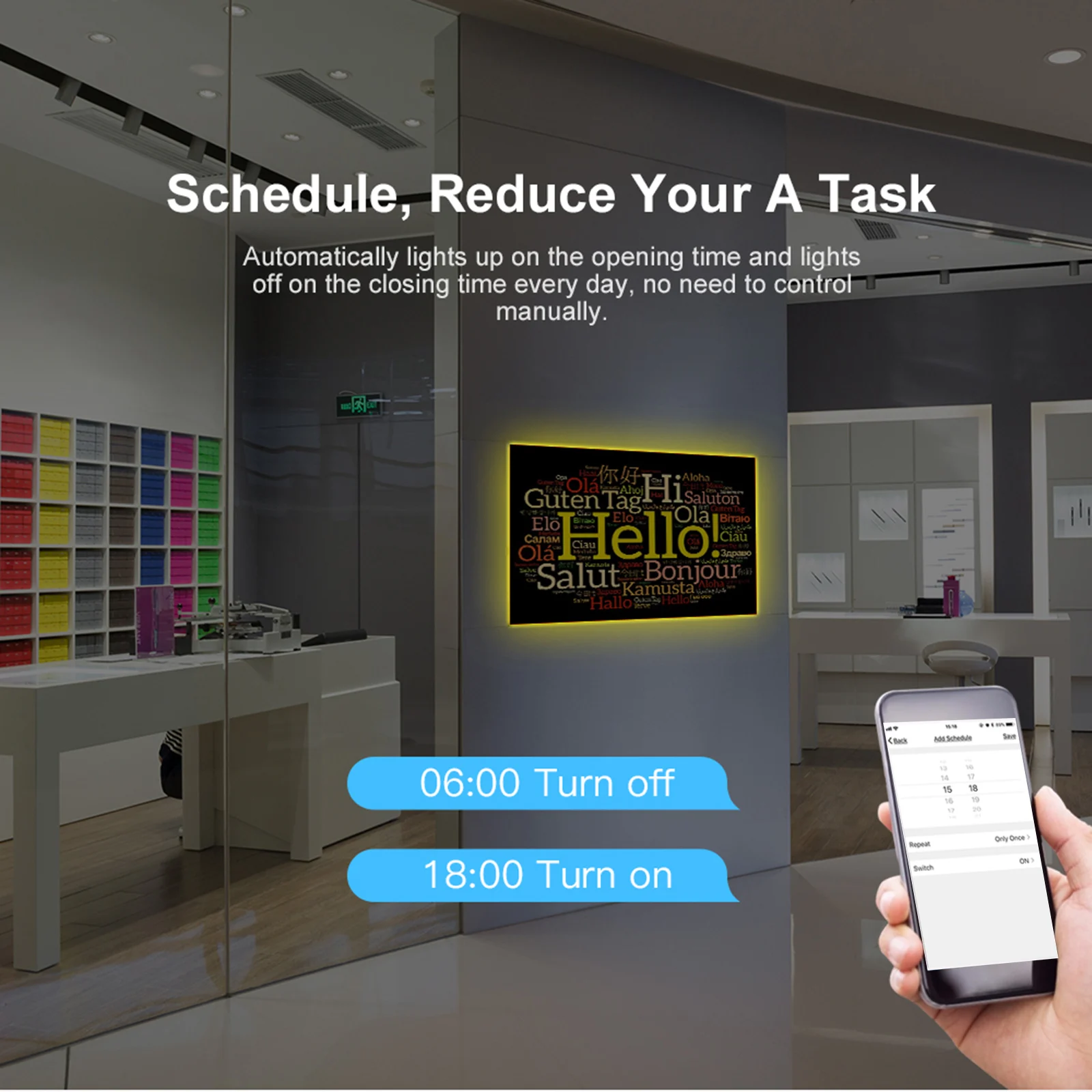 * График, уменьшите свою задачу: автоматически загорается на время открытия и выключается на время закрытия каждый день, нет необходимости управлять вручную.