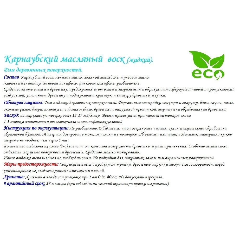 Инструкция по использованию: Перед использованием тщательно перемешать. Убедиться, что поверхность чистая, сухая и тщательно обработана абразивной бумагой. Нанести Карнаубский масляный воск на очищенную поверхность, предыдущее покрытие должно быть удалено.