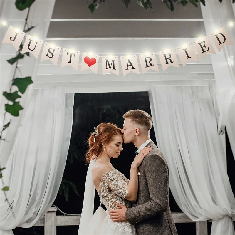 Just Married Mrs Wedding Banner Set with 8 LED Fairy String Lights Hanging Garland Flags for Bridal Shower Birthday Party Decor