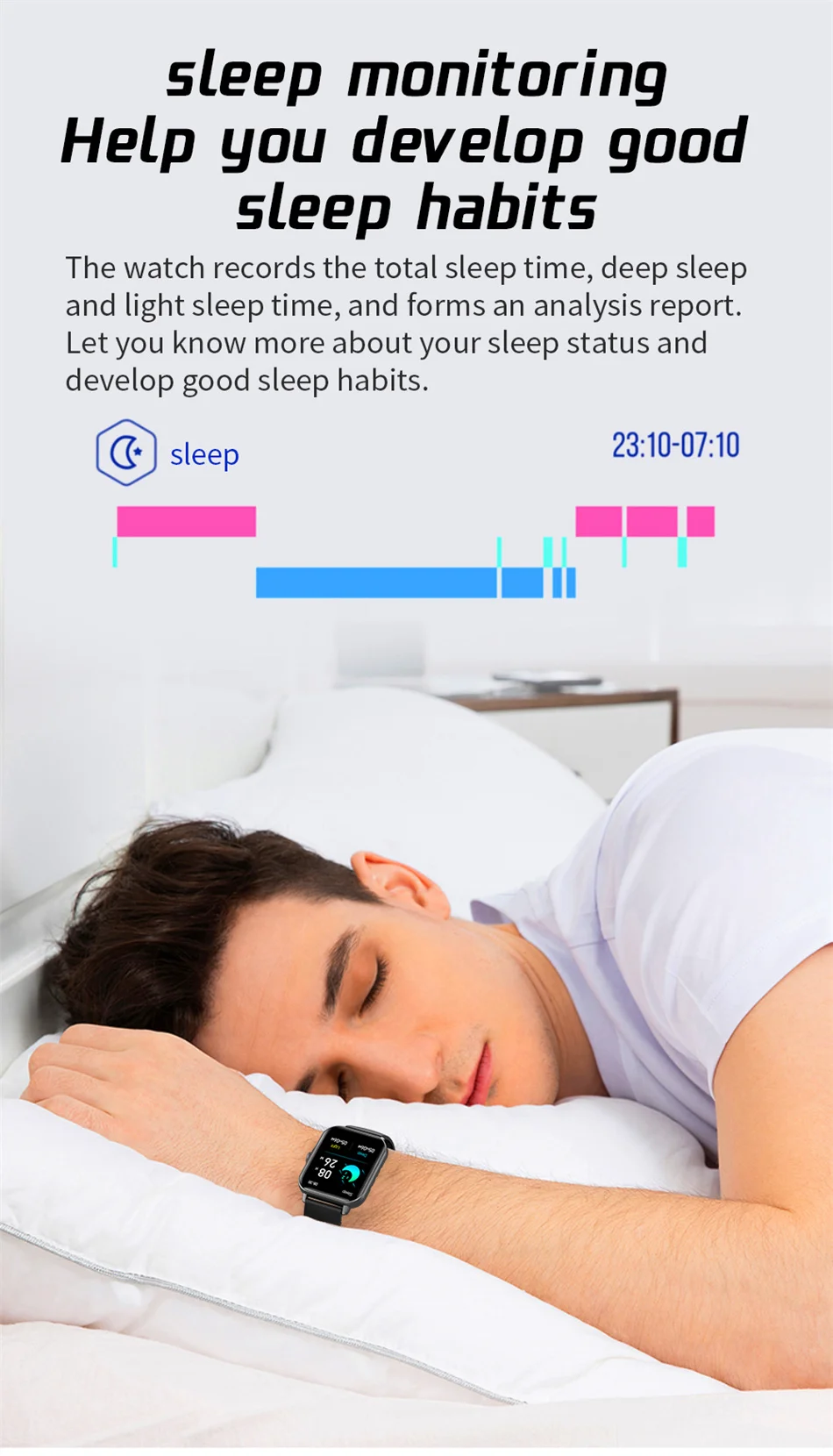 Функция: пульс/мониторинг сна/кровяное давление/кислород в крови/мультиспортивный режим/информация и социальная информация push/входящий вызов/Будильник/напоминание о сидячем положении/Секундомер/Поиск телефона/Удаленная камера