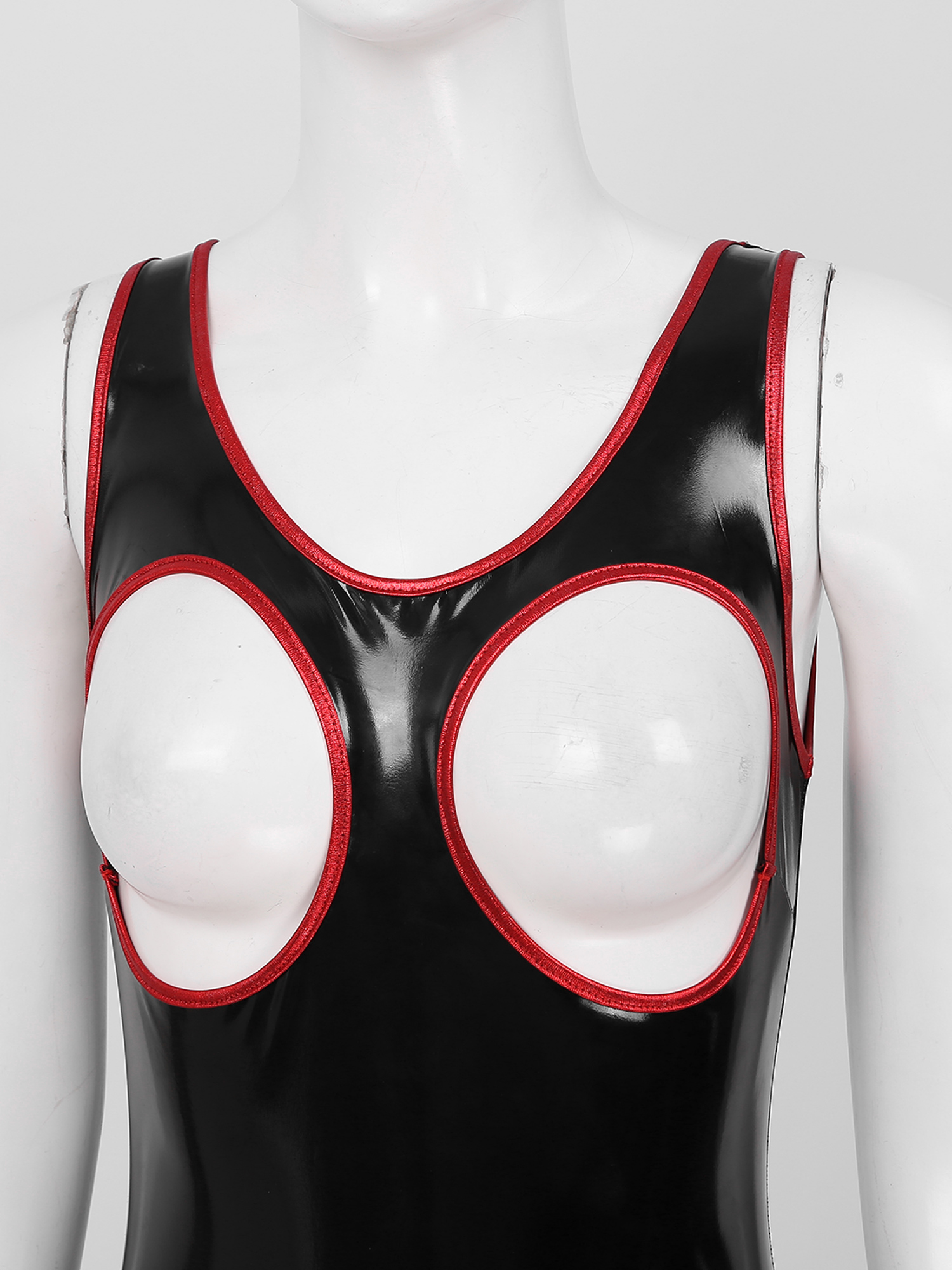 Женский Блестящий боди из лакированной кожи с открытой чашкой на молнии.