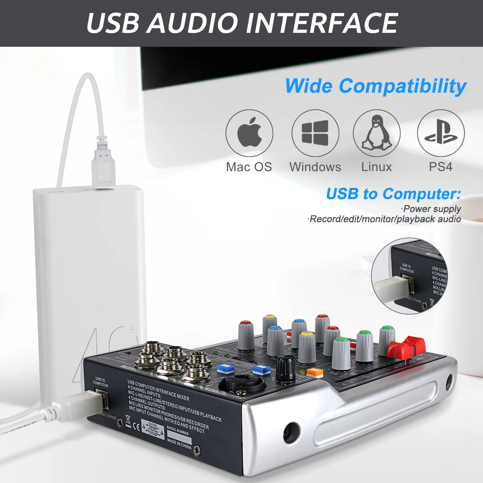 Встроенный аудиоинтерфейс может подключаться непосредственно к вашему ПК/Mac/PS4 и записывать/редактировать/контролировать высокое качество звука с помощью Pro Tools/Logic Pro X/GarageBand/Audacity и другого программного обеспечения. Он также работает с Mac Catalina и может выключить питание USB без необходимости адаптера