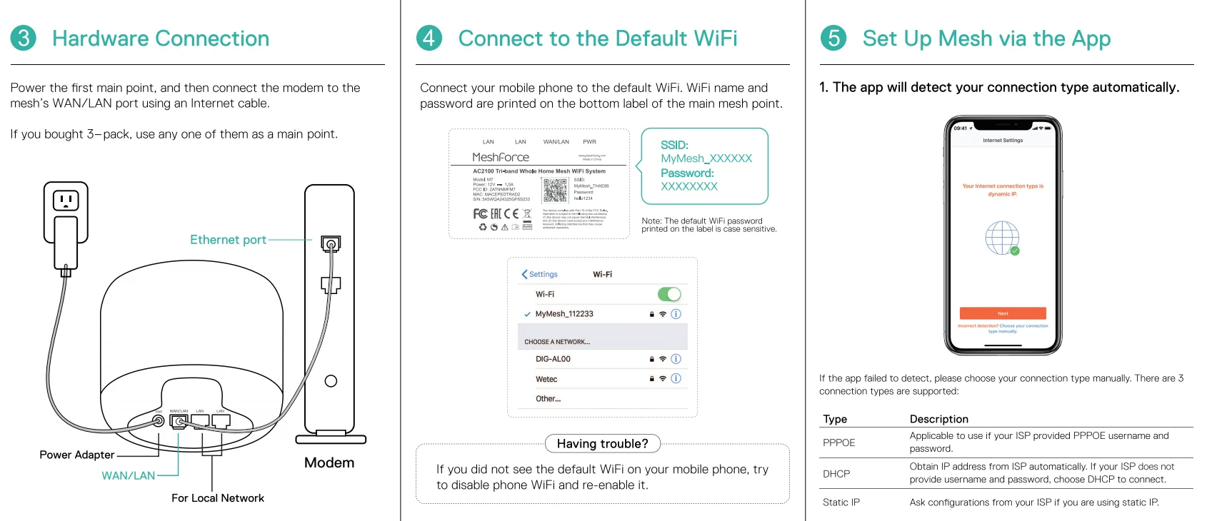 В посылка | 3 × точки WiFi meshforce, 3 × адаптеры питания, 1 × Кабель Ethernet, 1 × руководство по быстрому запуску |