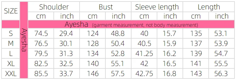 > Измерения в таблице размеров предназначены для самой одежды, а не для измерения тела. (Например, если размер груди вашего тела составляет 128 см, вы должны выбрать размер L, если длина подходит вам)