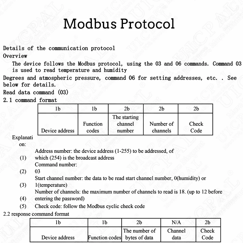 2, выход сигнала RS485. (Это устройство соответствует Протоколу Modbus, используя команды 03 и 06. Команда No. 03 используется для считывания температуры, влажности и атмосферного давления, и команда No. 06 используется для определения адреса и т. д.)