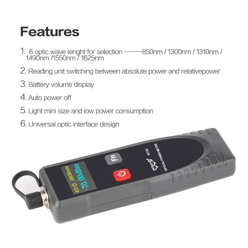 Принимая во внимание эргономику, этот мини-измеритель оптической мощности с компактными, портативными и простыми функциями эксплуатации специально разработан для профессионалов, которые выделяют, поддерживают оптоволоконную сеть. Этот блок широко применяется при выборе длины волны 6.