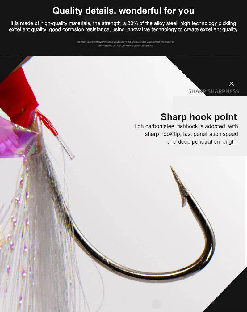 1. Острые точки крючка: изготовлены из высокоуглеродистой стали, точка крюка невероятно острая и быстро прокалывается.