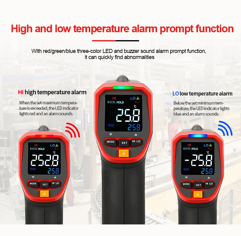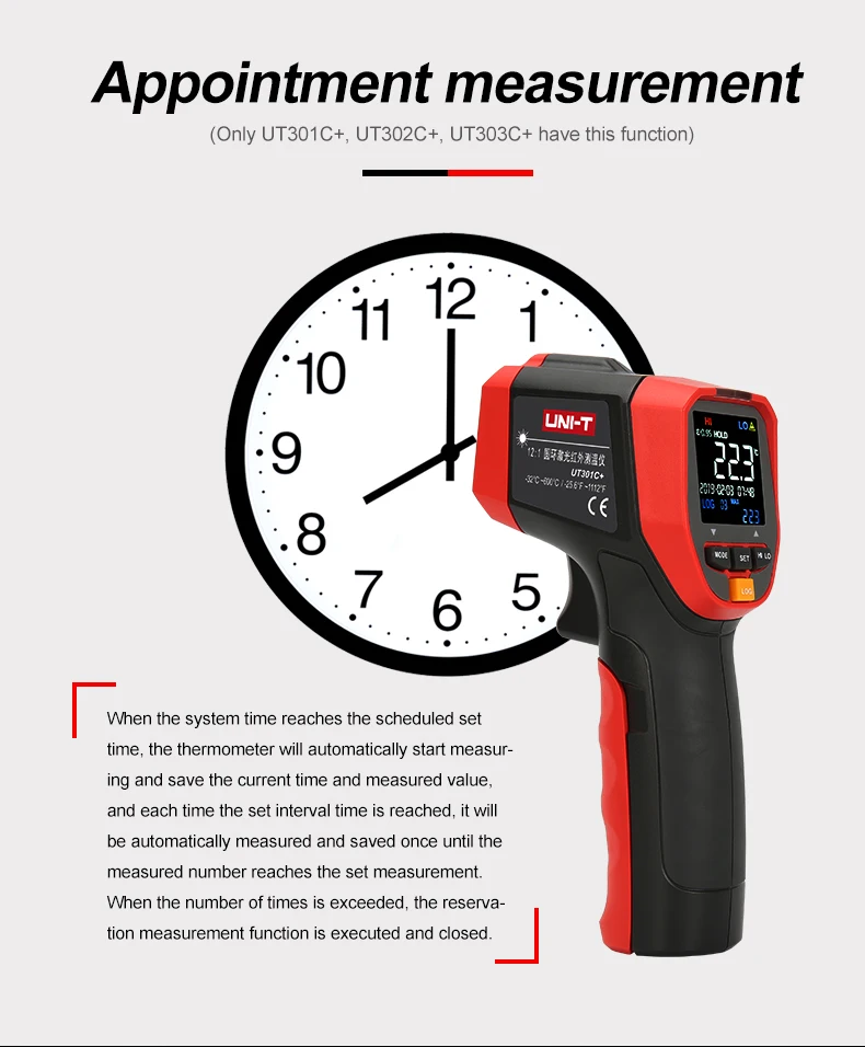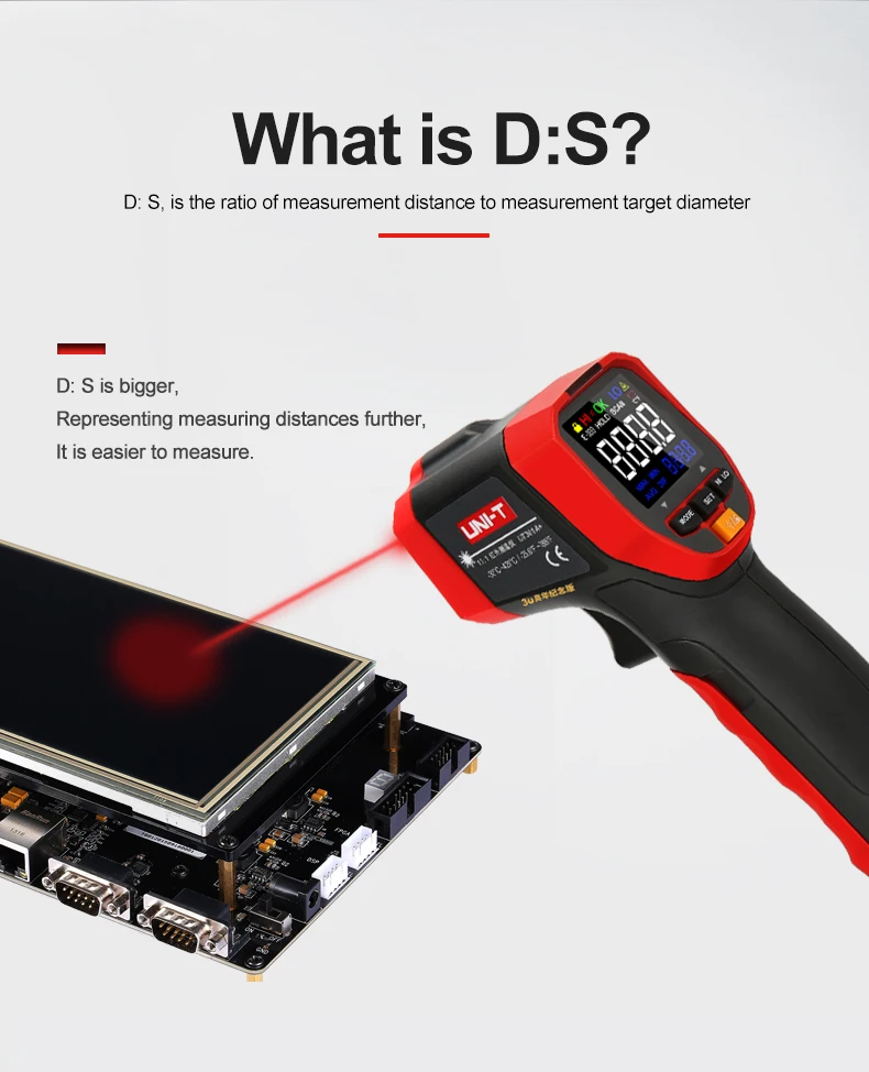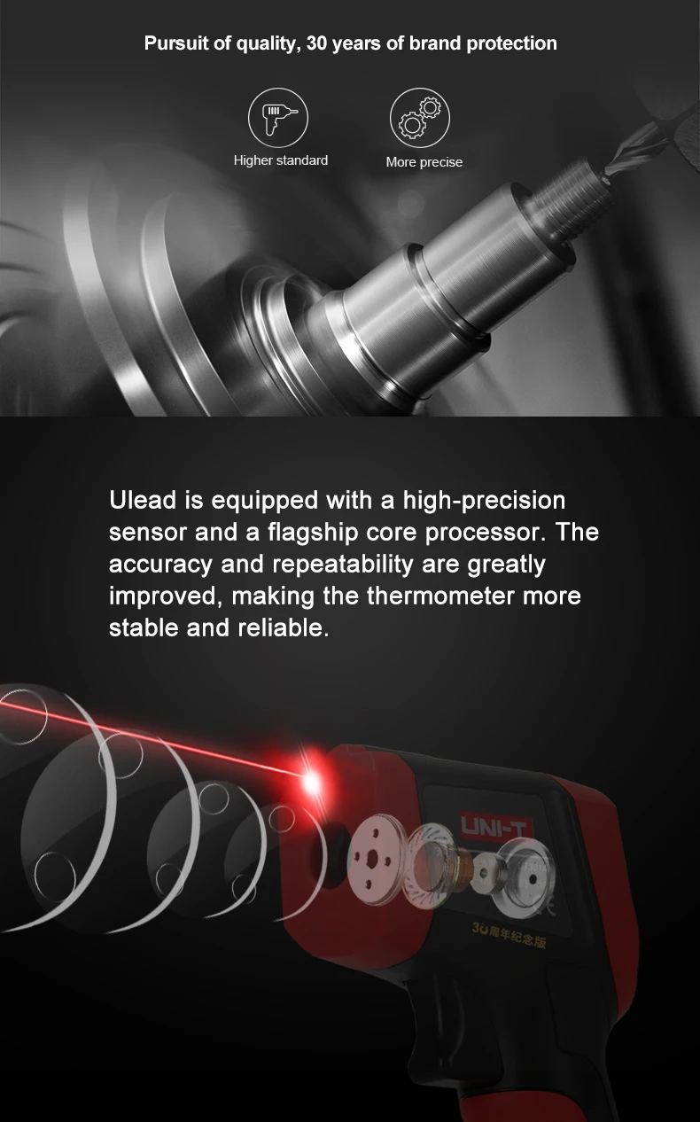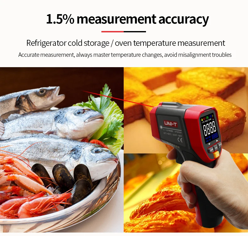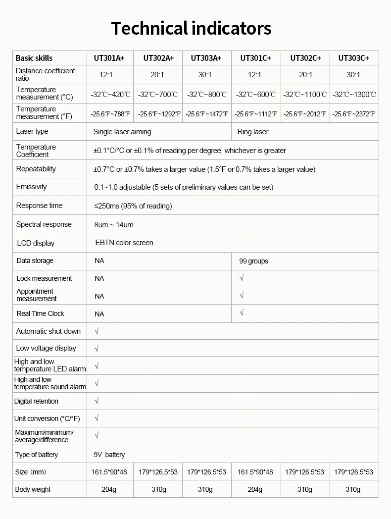 Новая серия UT301 +-это прочный и простой в использовании инфракрасный термометр с высокой точностью/энергией (95%)/повторяемостью. Он обладает регулируемой высокой и низкой температурой визуального/звукового сигнала, реагируя быстрее, чем 250 мс, что может помочь вам быстро найти аномалии. Вы можете задать и сохранить 5 наборов значений излучения и быстро Переключить излучение в соответствии с различными поверхностями, чтобы получить более точные результаты. С замером замка, макс./мин/AVG/DIFF hold, и штативом, UT301A + идеально подходит для процессов, требующих контроля температуры. UT301A + может быть применен к распределению электроэнергии/транспортировке оборудования инспекции, HVAC/оборудование обслуживания, устранения неисправностей транспортного средства и других областях.