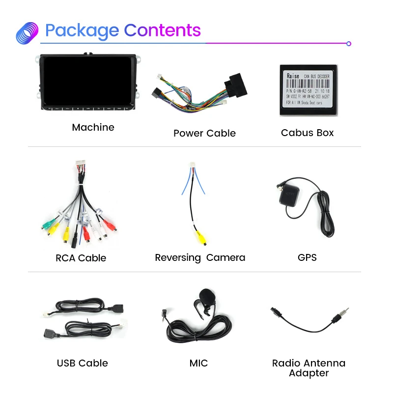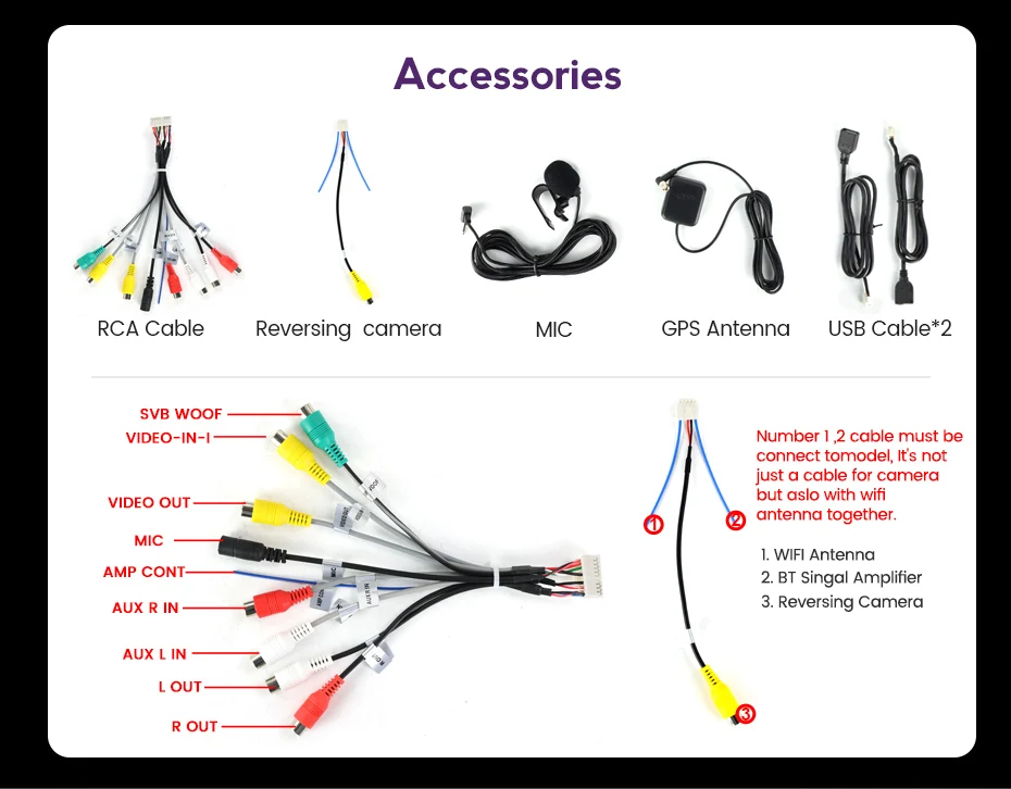 Один кабель питания ISO+Один RCA кабель с внешним входом микрофона+Один Реверсивный кабель камеры с WiFi и BT сигнальными кабелями+Один антенный кабель GPS+Два usb-кабеля+Один внешний микрофон+Одна инструкция по эксплуатации.