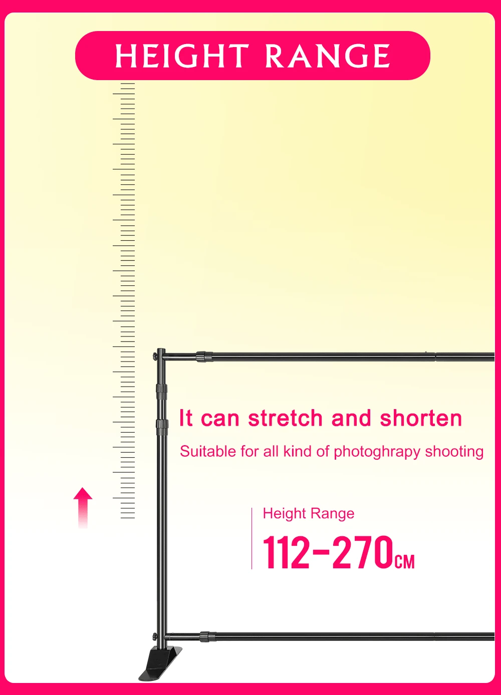 Фоторамка регулируется от 197,5x104,5 см до 340x270 см (ширина x высота) перекладина и стойка телескопическая и регулируемая, не стесняйтесь регулировать длину и высоту. Двойная перекладина, может носить более тяжелую вещь, более стабильную и прочную. Однотипное основание, более стабильное и прочное, экономит использованное пространство. Легко установить и разобрать, только 5 mintue,bulid фоторамка. Включая сумку для переноски, вы можете поместить заднюю рамку в сумку для переноски, легко носить с собой.