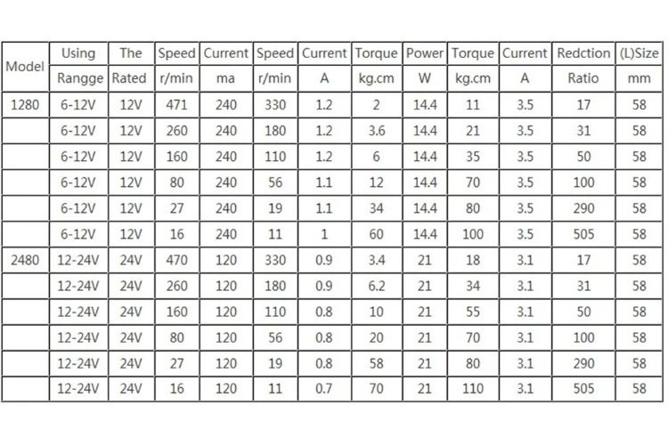 Скорость без нагрузки: 7 об/мин, 10 об/мин, 12 об/мин, 16 об/мин, 27 об/мин, 40 об/мин, 80 об/мин, 160 об/мин, 260 об/мин, 470 об/мин