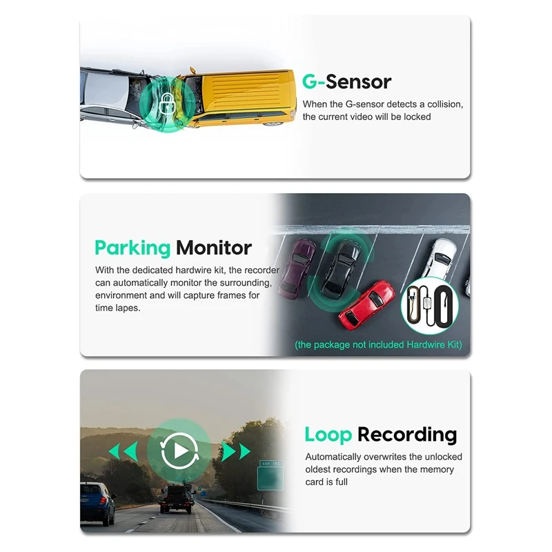 3.If you need dash cam record 24 hours after parked, you need to buy a hardwire kit separately