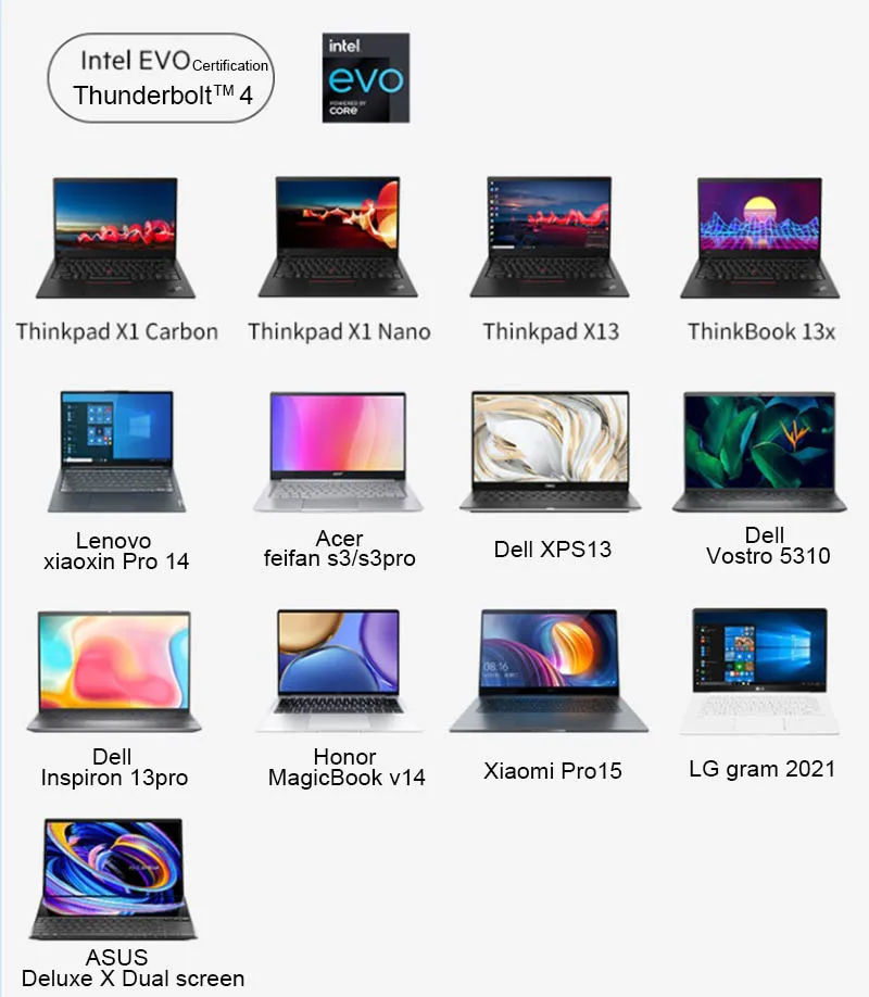 Следующим образом, они являются частями ноутбуков Intel EVO platform certified Thunderbolt 4. Все они поддерживают четыре экрана для одновременного отображения различного содержимого