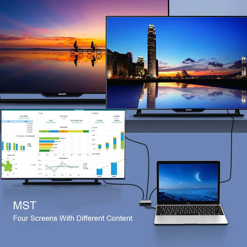 Функция-6: Поддержка MST, поддержка расширенного режима расширит более 2 мониторов, чтобы показать различное содержимое на Windows