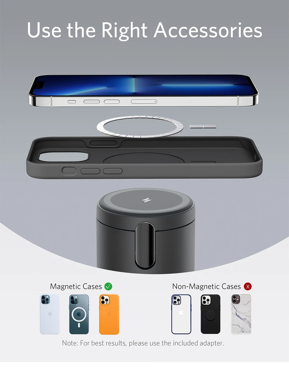 -Не совместим с не-чехол для телефона Магнитный, такой как защитные чехлы OtterBox. Магнитные и металлические насадки, такие как карты, ключи и ручки pop, будут мешать зарядке.