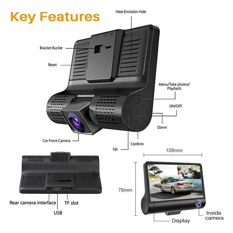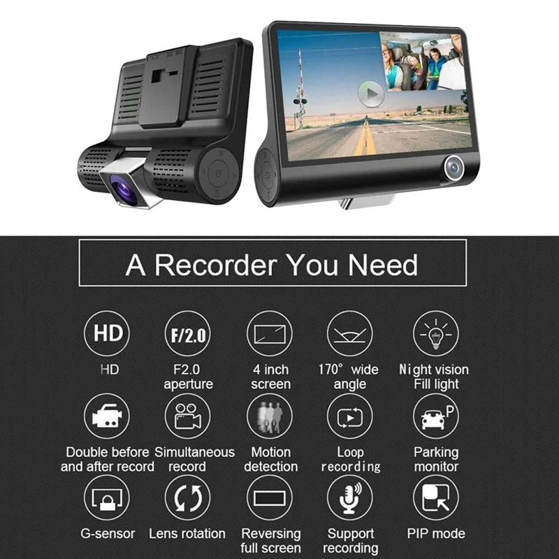 [3 Lens Car Cameras]This car dashcam features 3-way cameras: front, inside, and rear dash camera, which provide you with a full range of monitoring. The front camera applies vehicle video record, inside camera record the happy times inside your car, rear camera for parking assistance. Open a new era of three-way record mode. [24H Parking Monitor ]Car camera recorder with parking mode means dash camera will automatically record when there is something heavy hit your car or some collision happens from other outside power, so that you can know the details, maybe they are good for the compensation in the later dealing if need. Please connect the driving recorder to the power supply with a hardwire kit cable. [G-Sensor]The car driving recorder built-in G-sensor acceleration transducer, G-sensor senses sudden acceleration, braking, and collisions to capture and protect critical footage surrounding an accident automatically. Through this function, the essential files won't be covered by the loop recording function. [Loop Seamless Recording]This function ensures your car camera does not stop recording when the SD card is full. The dashcam will cover the previous video files to continue recording. [1080P HD 4 Inch Screen]This dashboard car camera adopts high-performance and low illumination CMOS WXGA HD photographic Chip, 1080P 4 inch IPS full screen displays precise and meticulous. NOTE: Please tear off the protective film of the screen before you use it! Output 12V and input 5V, which is suitable for small cars. If it is a truck, 24V needs to be connected to a step-down line.