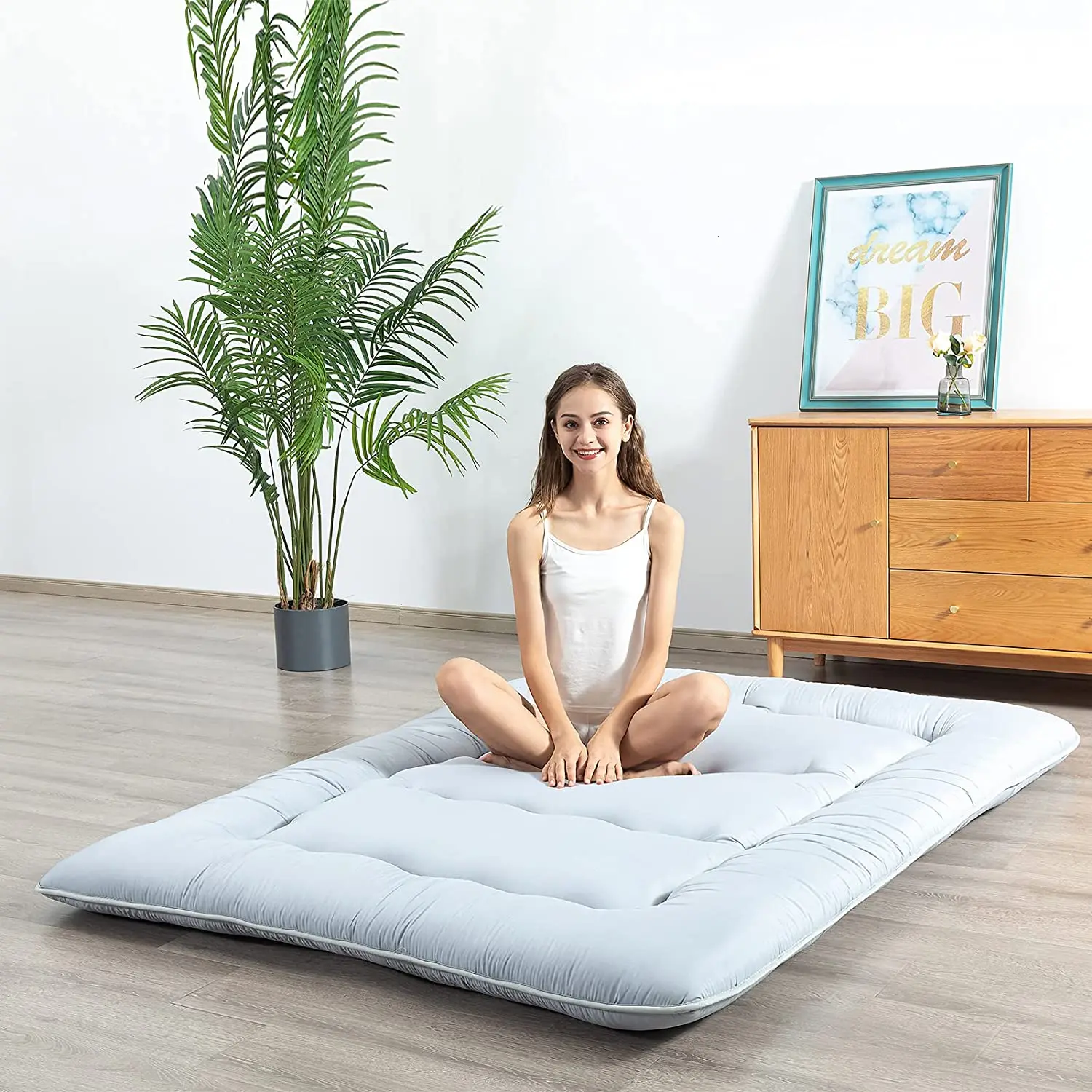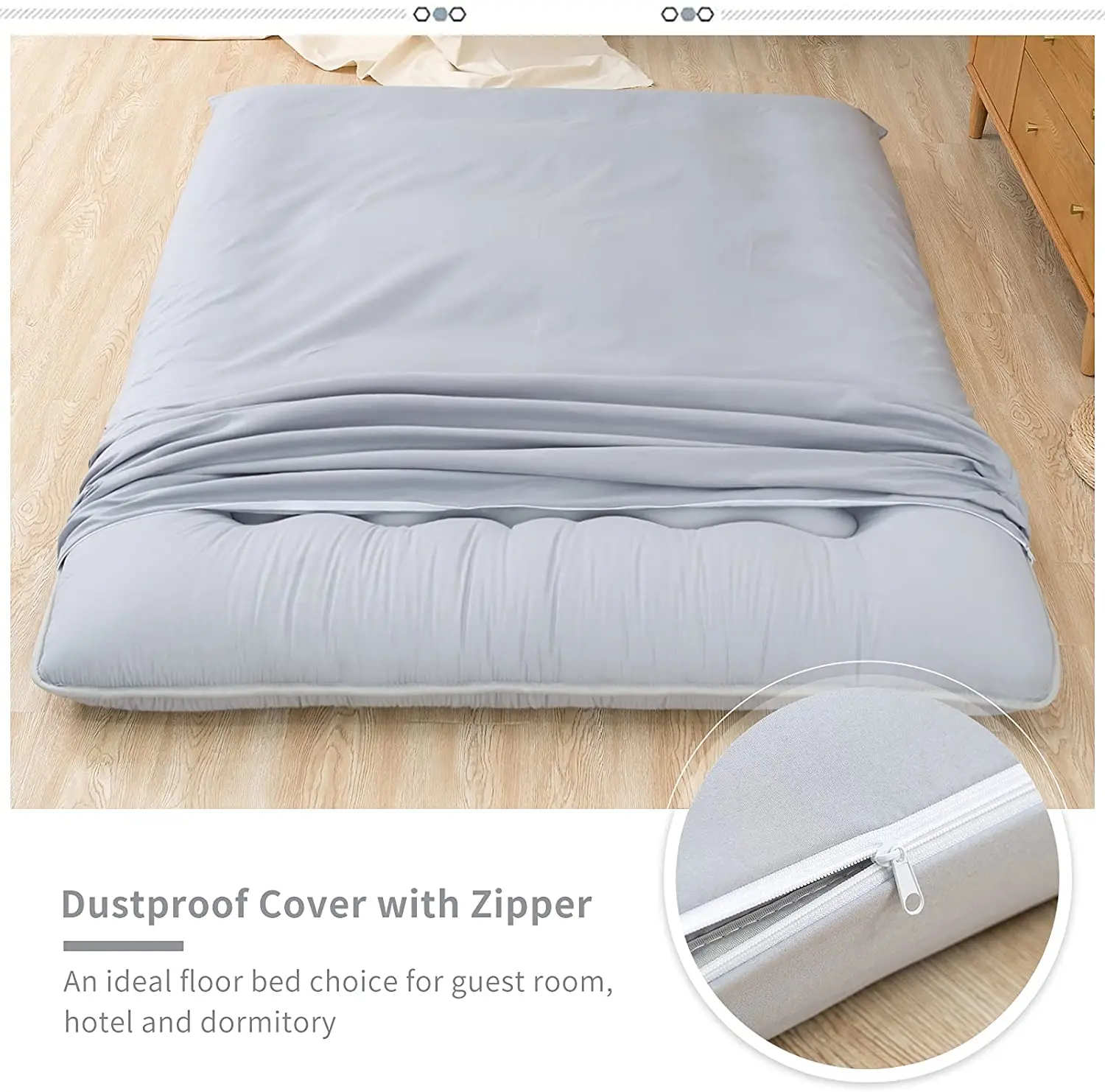 Многофункциональный матрас: Этот напольный матрас является идеальным выбором напольной кровати для номера, отеля, общежития, больницы, путешествий и вашего гостя. Может использоваться как напольный матрас, коврик для кемпинга, спальная футон, футон для гостиной, напольный шезлонг, татами коврик, коврик для спального пола, гостевая кровать, японский коврик для кровати, также может быть детский игровой коврик, напольная подушка