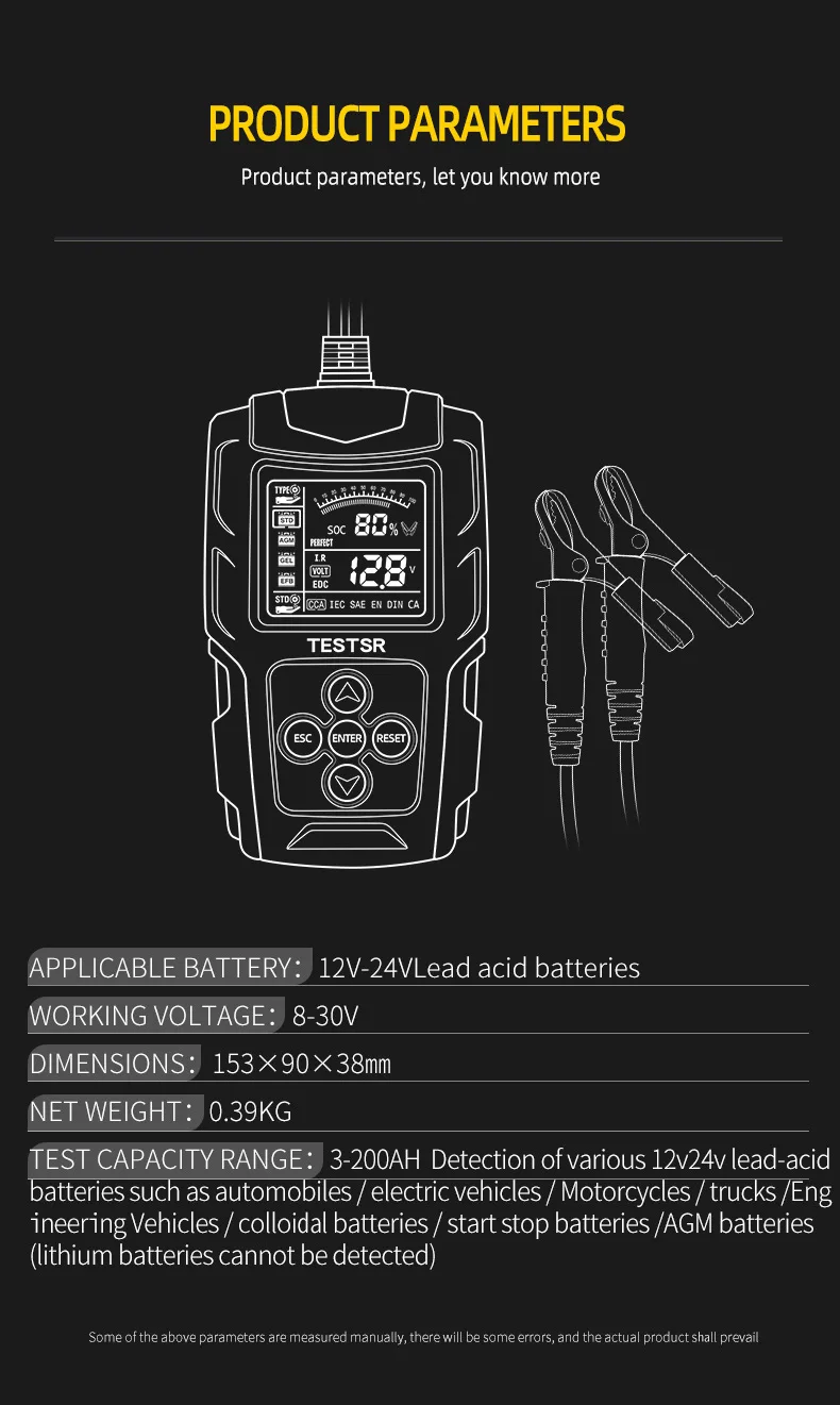 Usage scope: All car lead-acid starter battery, including regular flooded, EFB, AGM tablet battery, AGM winding battery, GEL battery,WET, etc.