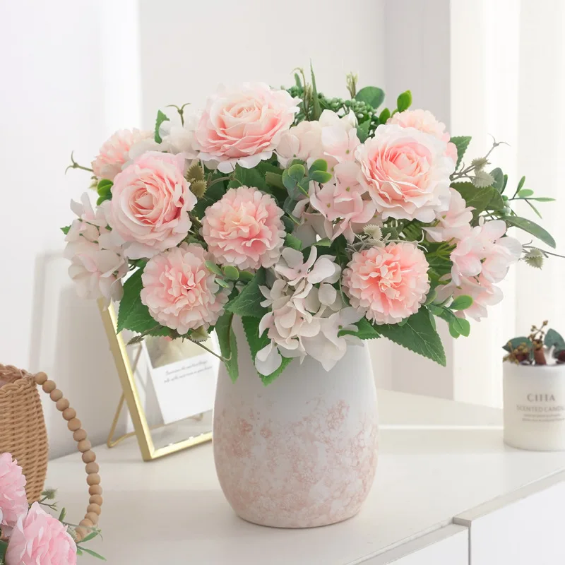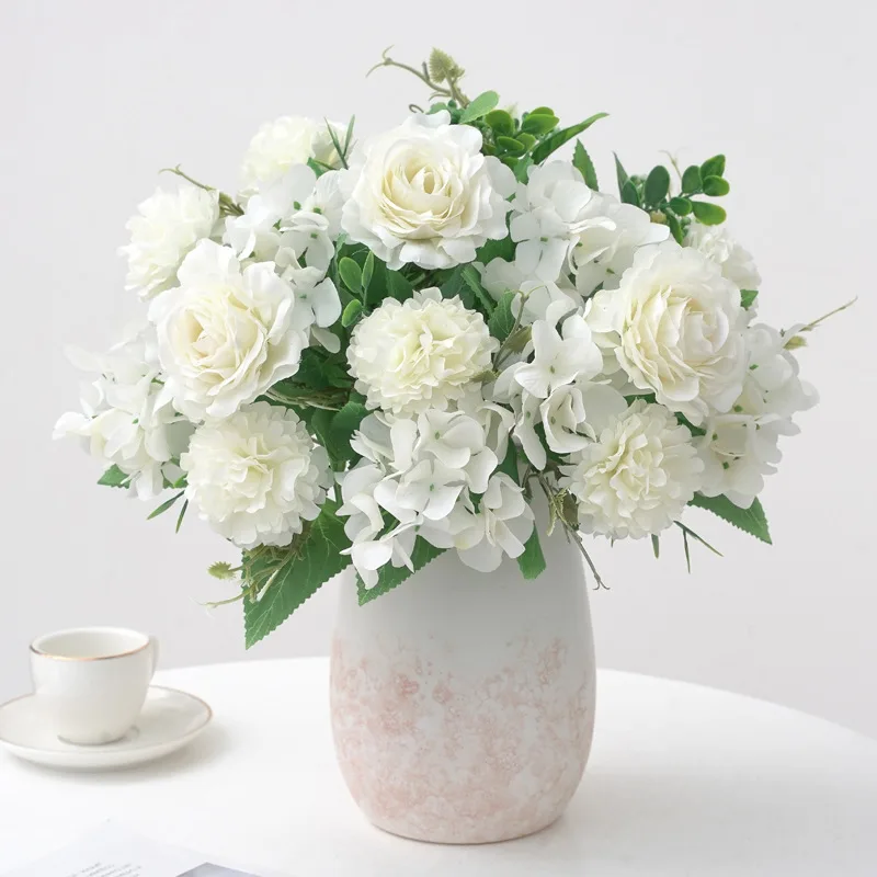 Посылка включает в себя: 1 пучок = в комплекте (6 вилок, 1 роза, 2 гортензии, 2 мяча, 6 наборов листьев растений)