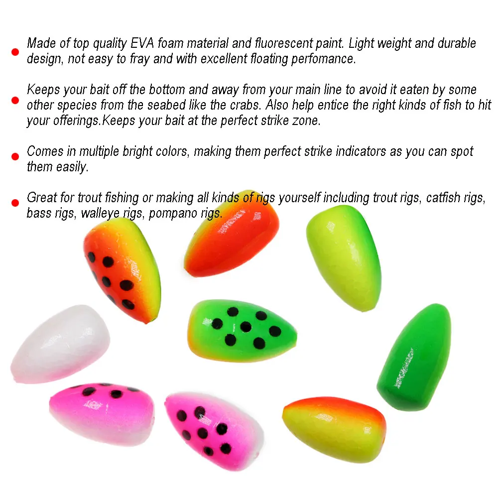 Изготовлен из высококачественного вспененного материала EVA и флуоресцентной краски. Светильник отличается большим весом и прочностью, не легко развевается и обладает превосходным плавучим эффектом. Удерживает вашу приманку от дна и вдали от основной линии, чтобы избежать ее едят некоторые другие виды с морского дна, такие как крабы. Также помогите заинтересовать нужные виды рыб, чтобы поразить ваши предложения. Держит вашу приманку в идеальной зоне удара. Поставляется в нескольких ярких цветах, что делает их идеальными индикаторами ударов, так как вы можете их легко осветить. Отлично подходит для ловли форели или изготовления всех видов буровых установок, включая форель, буровые установки для ловли рыбы, басовые буровые установки, буровые установки для ловли форели, Pompano rigs. Отверстие в центре рыболовного поплавка, леска может легко проходить через отверстие. Пулевые поплавки помогут вам контролировать глубину вашей приманки, когда вы ищете нижний укус! Вы можете поставить эту установку на несколько видов, многие виды рыб питаются на дне, и она отлично подходит для них!