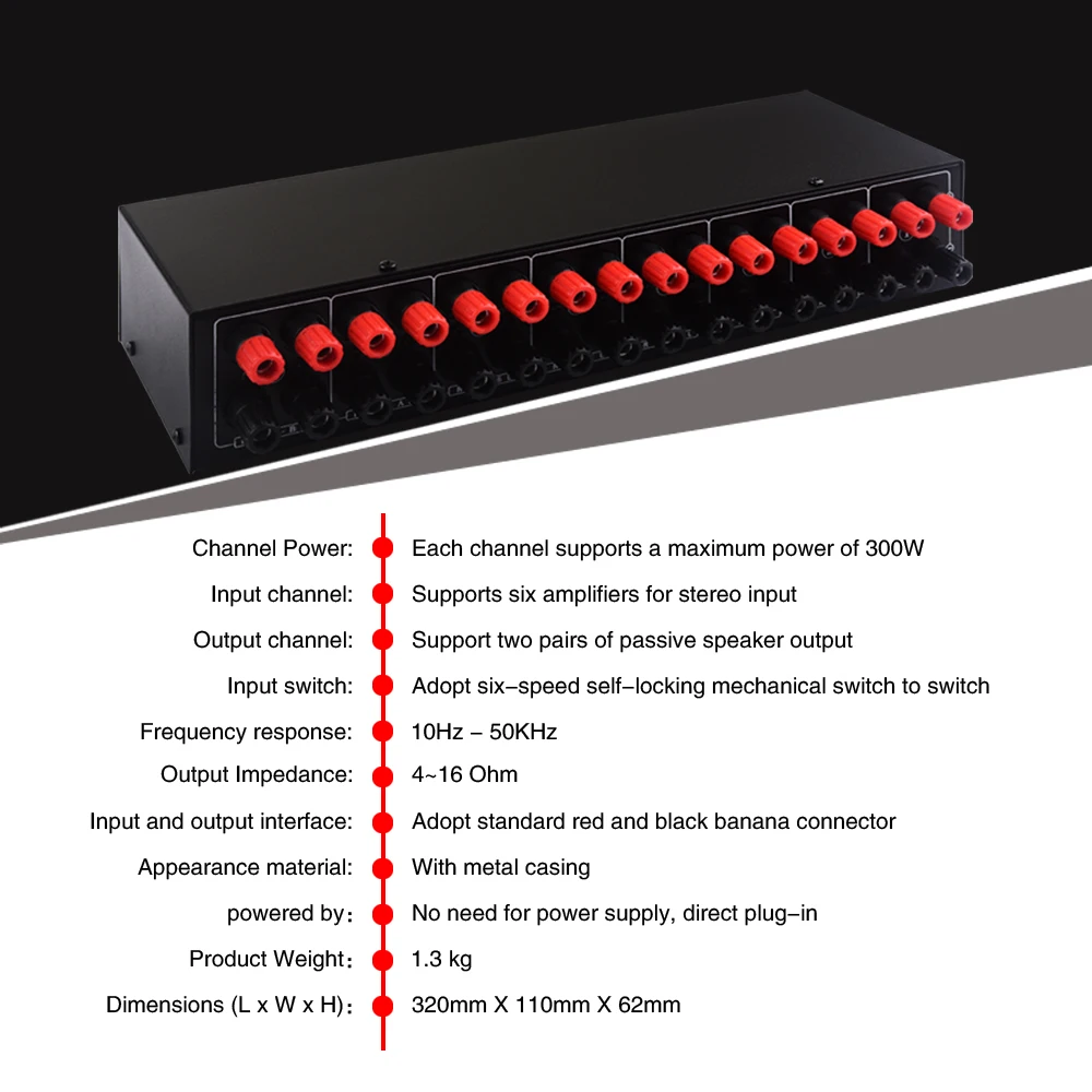 1: 6 комплектов усилитель мощности кнопочный переключатель Выберите выход, 2 комплекта стереофонический громкоговоритель кнопочный переключатель Выберите выход (2 комплекта громкоговорителей могут быть независимо запущены или закрыты)