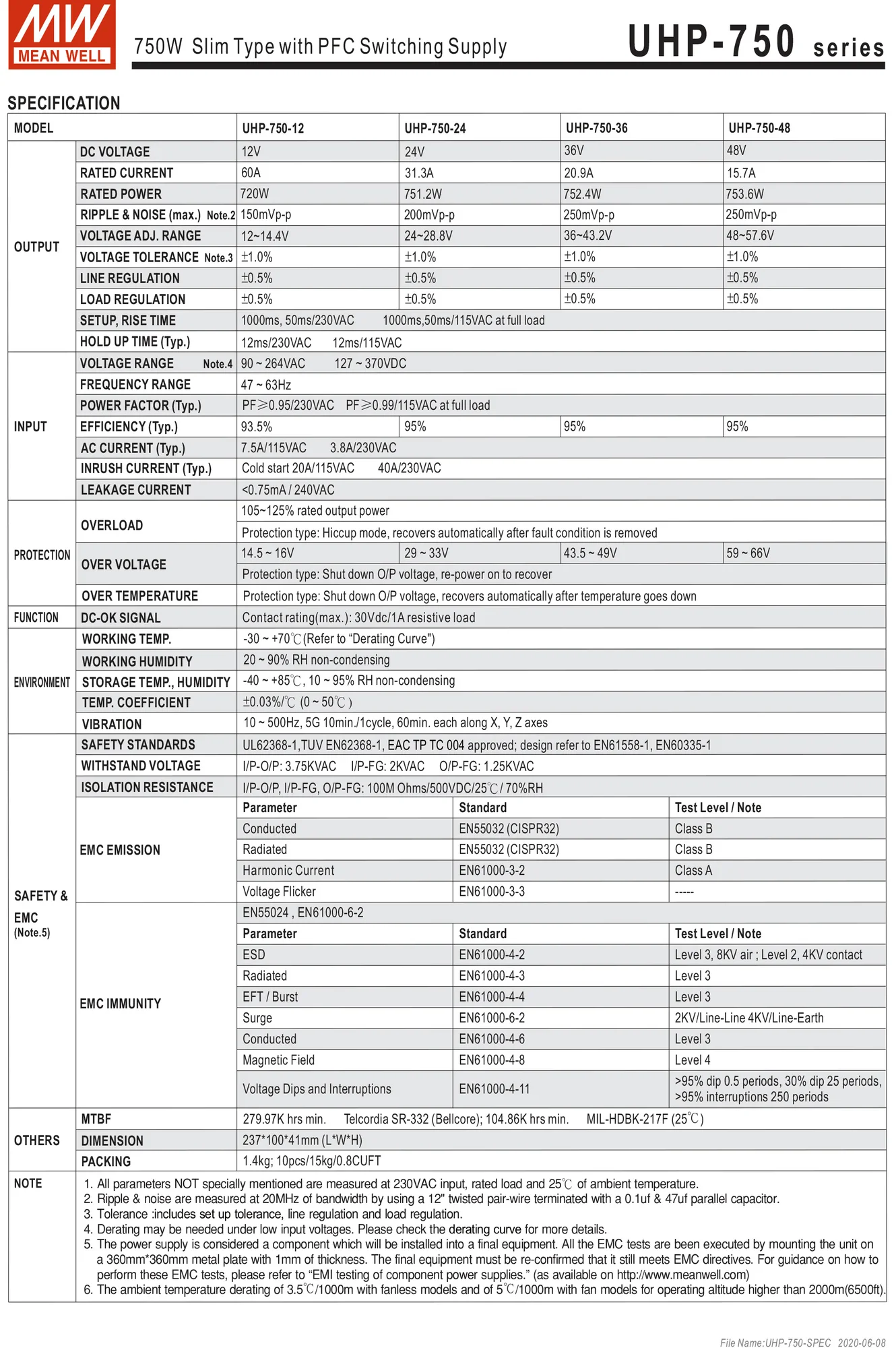 Adopting the full range 90~264VAC input, the entire series provides an output voltage line of 12V,24V,36v and 48V. In addition to the high efficiency up to 95%, that the whole series operates from -30℃ ~ 70℃ under airconvection without fan.UHP-750 has the complete protection functions and 5Ganti-vibration capability; lt is complied with the international safety regulations such as TUVEN62368-1 and UL62368-1. and design refers toEN61558-1 and EN60335-1.UHP-750 series serves as a high performance power supply solution for various industrial applications.