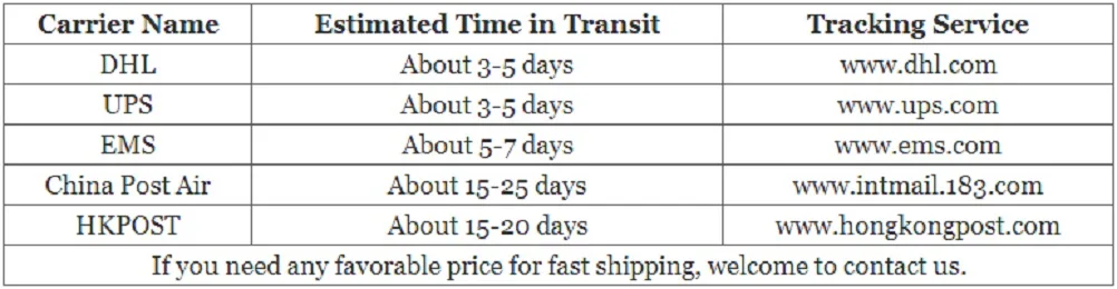 4. Как правило, посылки отправляются авиа-отправление Почты Китая, что занимает 15-25 рабочих дней в зависимости от страны, погодных условий, праздников и так далее. Если вам нужны товары в спешке, пожалуйста, свяжитесь с нами для другого способа доставки (как показано ниже), который требует дополнительной платы.