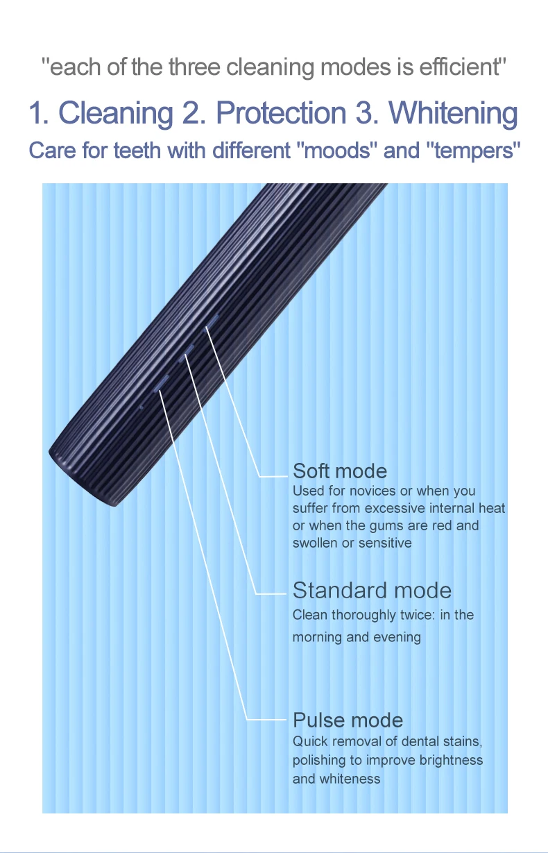 Импульсном режиме:Быстрое удаление зубных пятен, полировка для улучшения яркости и белизны