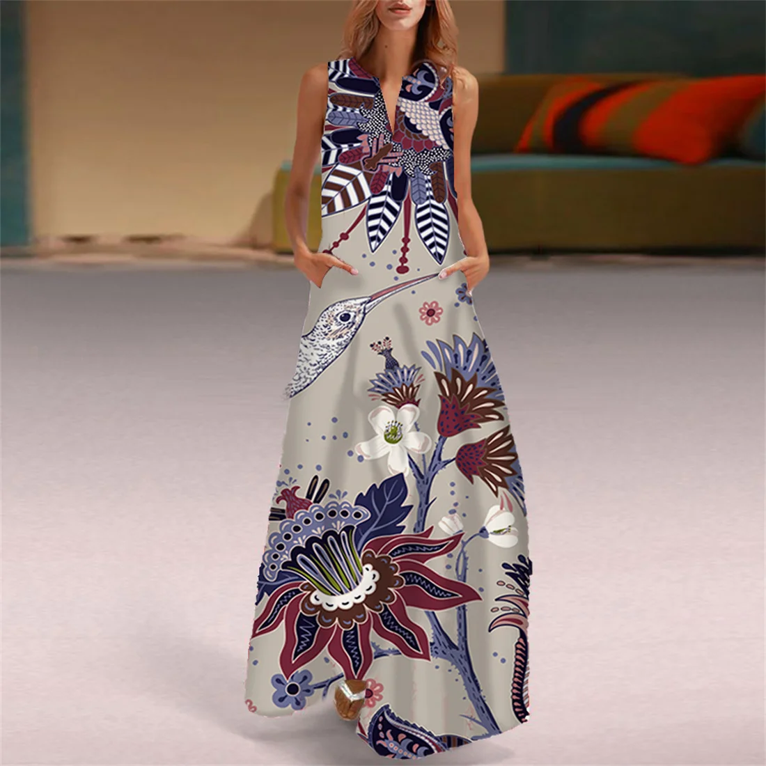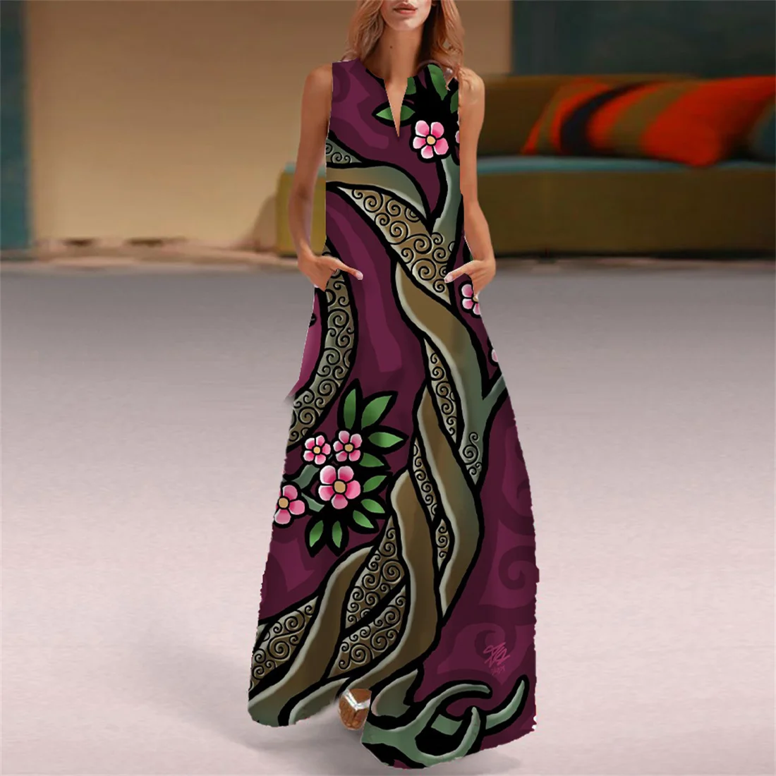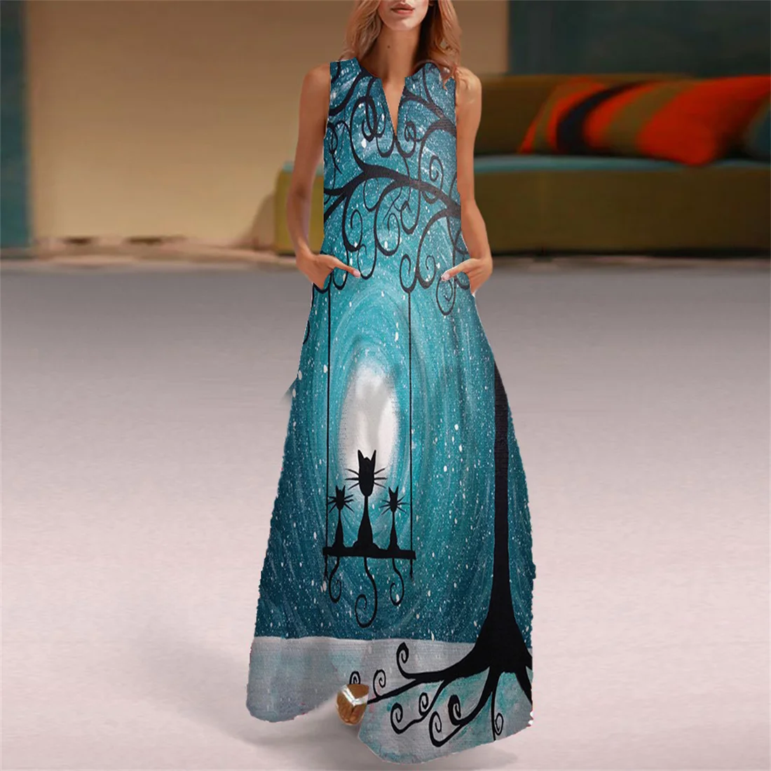 Женское свободное платье до колена в стиле бохо с v-образным вырезом и коротким рукавом в полоску в горошек