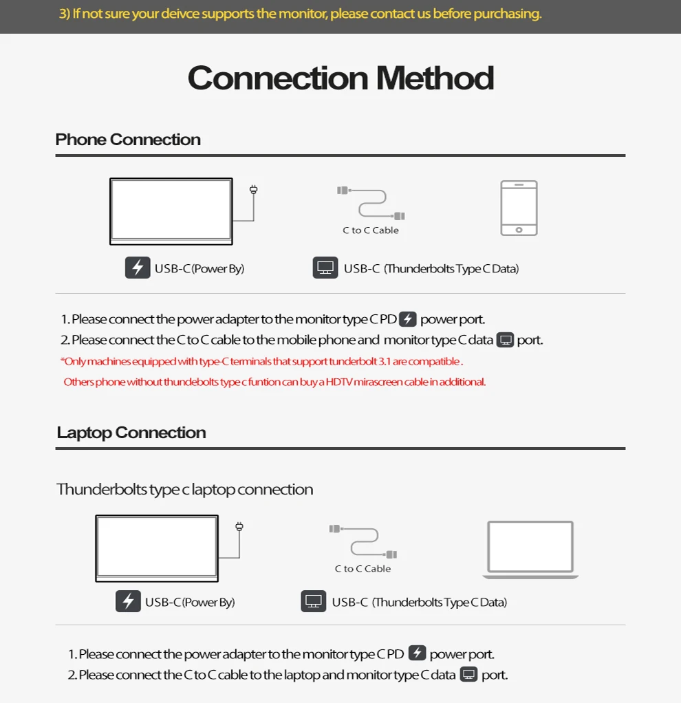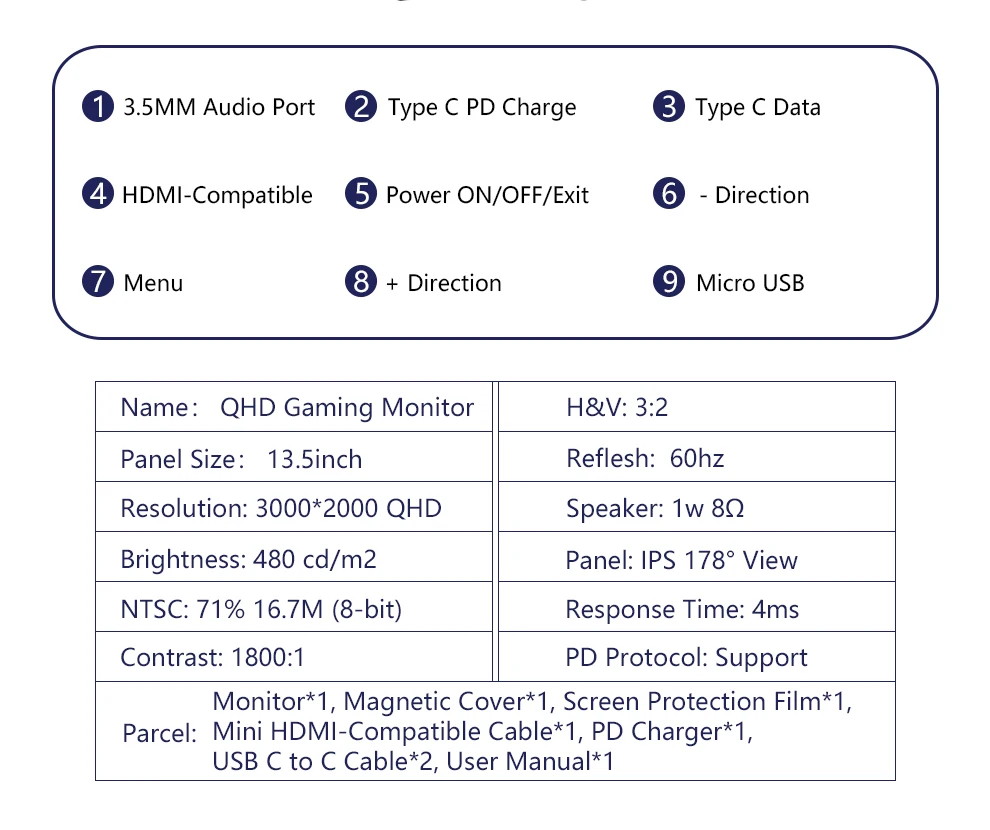 О: все эти устройства соединены с монитором через HDMI-совместимое соединение. Во-первых: питание от монитора с зарядным устройством входит в комплект (Подключите порт pd типа c); Во-вторых, Mini HDMI-совместимый с HDMI кабель для подключения устройства и монитора.