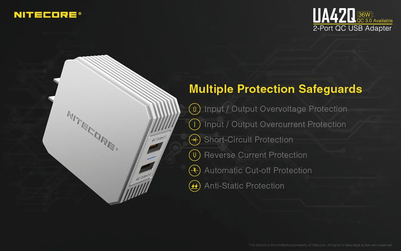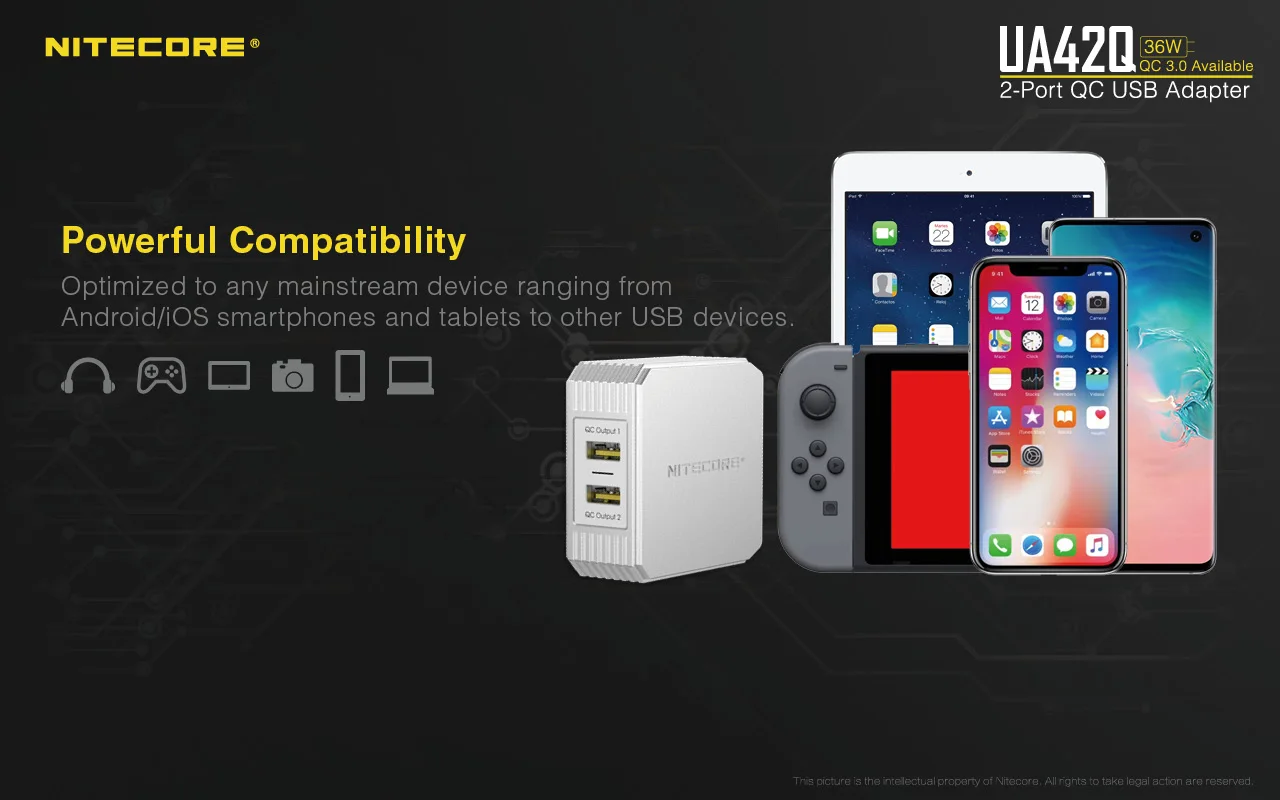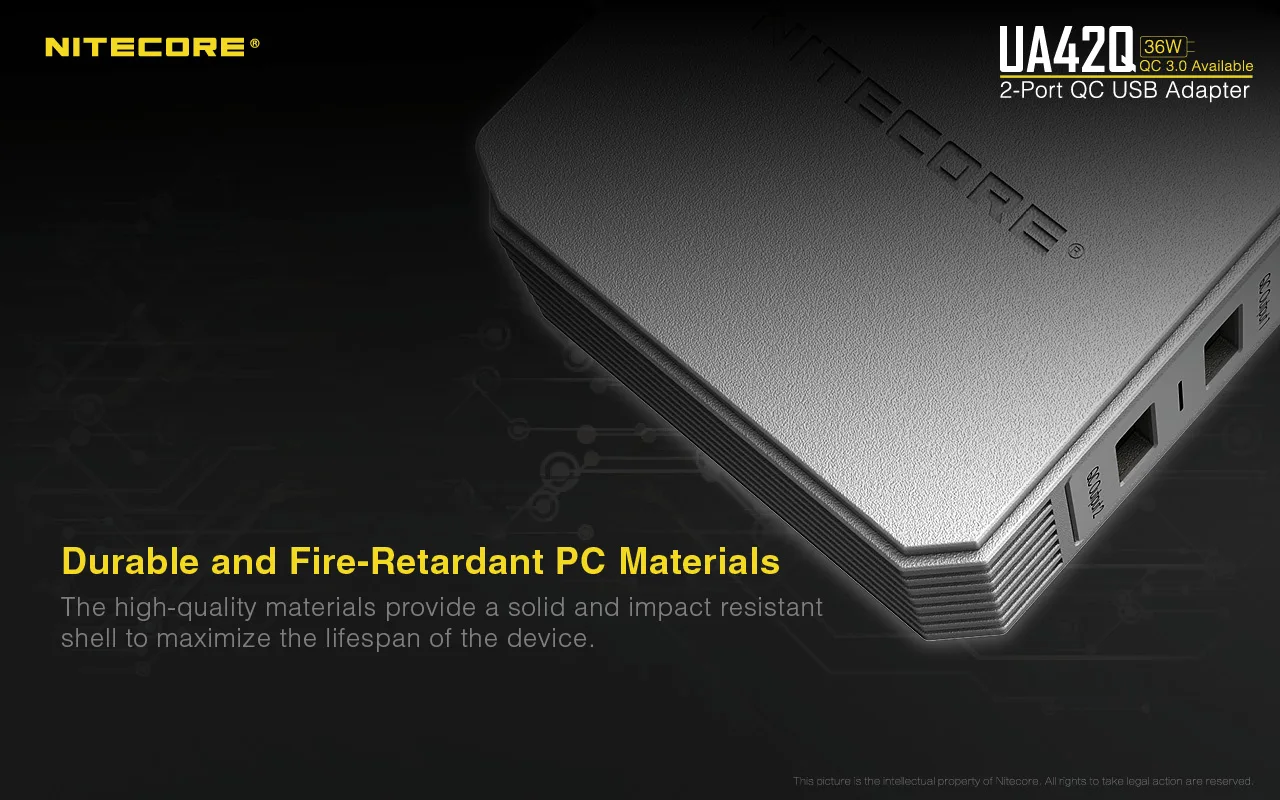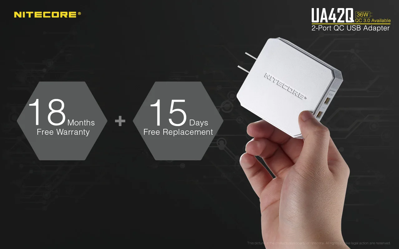 100% Оригинальный Nitecore UA42Q USB адаптер питания 36 Вт Быстрая зарядка USB 2,0 и 3,0 доступно 2 порта эффективная Высокоскоростная зарядка