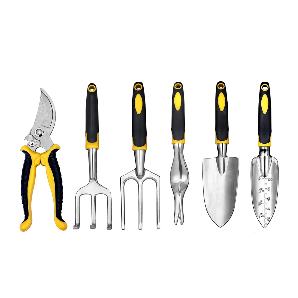 2 * Полный комплект: 1 * сумка для хранения инструментов, 1 * большая лопата, 1 * масштабная лопата, 1 * три грабли, 1 * три зубца, 1 * корневой экстрактор, 1 * садовые ножницы.