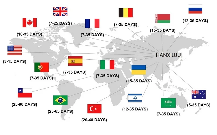 1. Мы отправим товар в течение 1-5 дней после подтверждения оплаты. Убедитесь, что вы указали правильный адрес доставки и телефон. Все товары будут отправлены только по адресу доставки, указанному Вами. 2. Иногда срок доставки может увеличиться в связи с плохой погодой, а также с потерей времени при таможенной очистке. Поэтому наберитесь терпения если вы не получили товар вовремя. Если вы не получили товар в течение 30 дней, пожалуйста, свяжитесь с нами, и я помогу вам отследить его. 3. Если вы хотите получить товар быстрее, пожалуйста, свяжитесь с нами. Мы можем отправить DHL / UPS/ TNT / DPD / FedEx. Это займет около 3 ~ 8 рабочих дней.