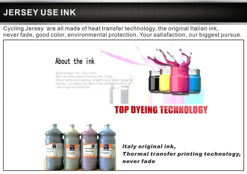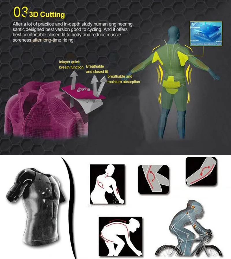 1.3D TAGLIO di SPORT VERSIONE 2.Jersey di Poliestere (Poliestere + Spandex Tessuto) 3.: traspirante/Quick-Dry/Confortevole/Anti-Pilling 4. Pantaloni (Lycra) 5.Shock Cuscino (9D Gel) Quando la luce solare sul ciclismo jersey, la maggior parte della luce viene riflessa indietro, in grado di prevenire efficacemente la maggior parte della radiazione UV in aria, ridurre i danni alla pelle Chiusura lampo dettagli Con auto-chiusura della chiusura lampo, liscio non-catena di carta, non si apre automaticamente quando si è In Bicicletta. Skid striscia con i dettagli Accoppiato con alta-qualità nastro antiscivolo, più confortevole esperienza Ciclistica. TESSUTO LATO Grande Tessuto di Griglia. Altamente Elastico, Altamente Traspirante. Dettagli tasca Dopo la borsa con tre grandi capacità disegno della tasca, in modo da poter memorizzare alcune piccole cose quando In Bicicletta