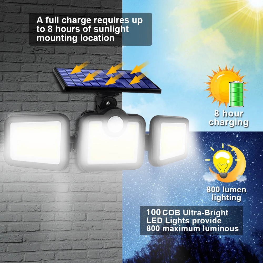 Googor лампа на солнечной батарее с датчиком движения оснащена 100 супер яркими светодиодами COB. Наша солнечная панель с модернизированным поликристаллическим кремнием до 20.5% коэффициента конверсии.