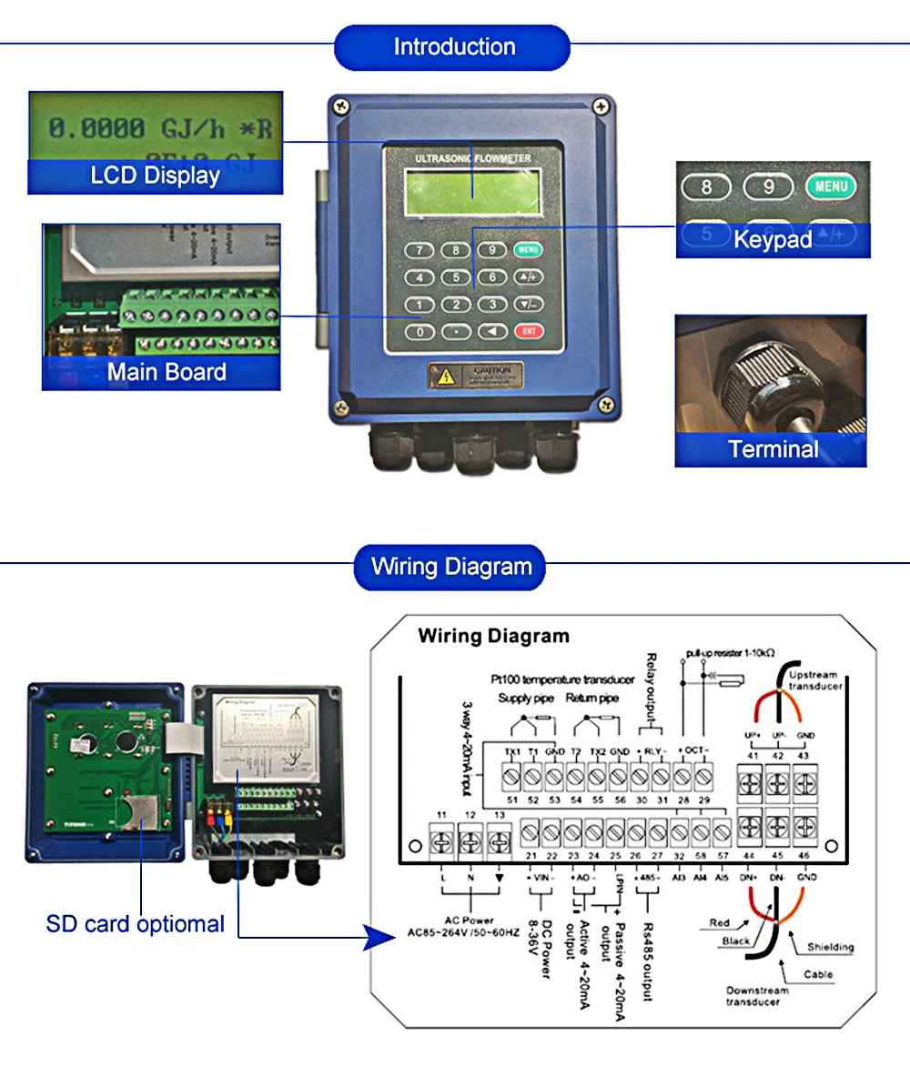 TUF-2000B Wall Mounted Water Flow Meter Transducer Optional SD Storage Clamp Sensor Digital Liquid Ultrasonic Flowmeter