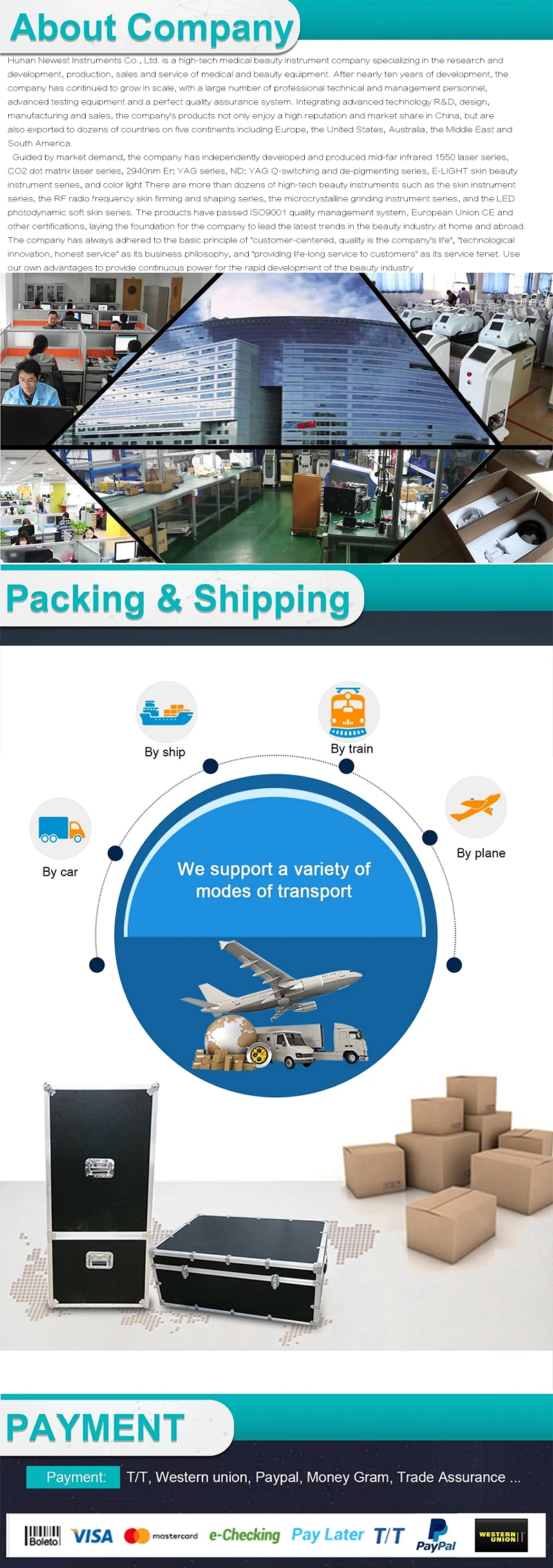 Наши методы логистики включают Экспресс-доставку (DHL, UPS, FedEx, TNT), 7-10 дней после доставки, специальную линию (включая таможенное оформление и налог, железную дорогу в Европу, срок около 35 дней, доставка в США, срок около 40 дней, в зависимости от логистической компании) И FOB. По умолчанию Режим логистики всех машин является специальной линией. Пожалуйста, свяжитесь со службой поддержки клиентов для получения подробной информации о режиме логистики. Режим логистики зависит от результатов общения со службой поддержки клиентов.