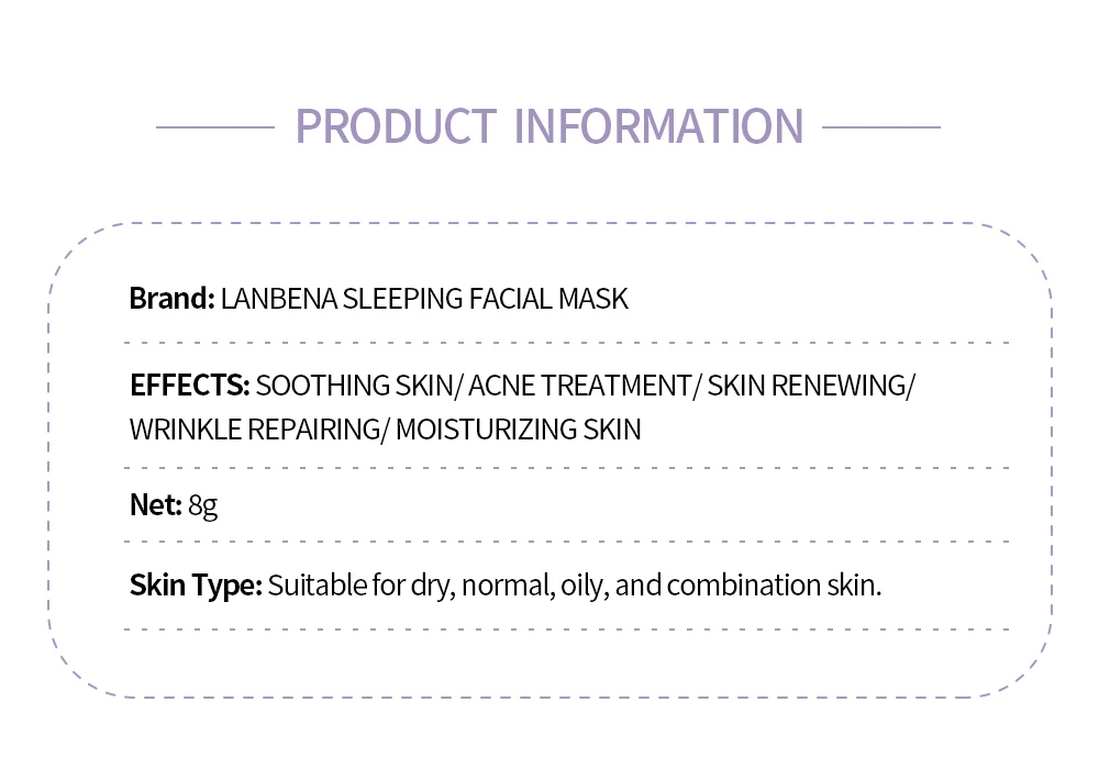 Он может увлажнить вашу кожу всю ночь, демонстрируя мягкую и нежную кожу на следующее утро. Это портативная и гигиеническая с независимой упаковкой. Содержит антиаллергическую патентованную формулу LANBENA и богатый витамин С, оказывает Эффект осветления тона кожи.