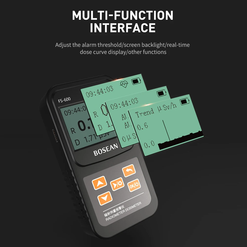 Various Screen Display Functions: You can adjust the alarm reading value, Chinese and English switching, screen backlight, real-time dose rate curve display function and so on according to your needs.