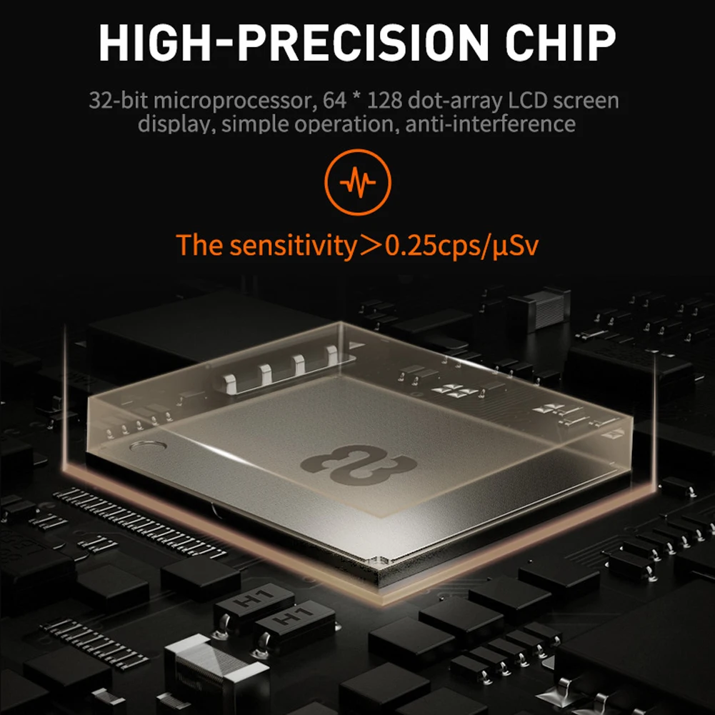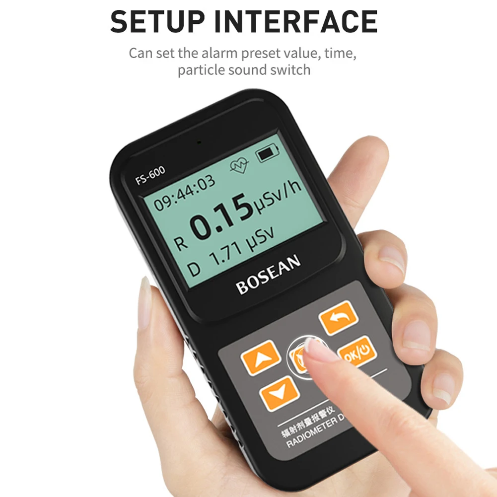 Различные функции экрана:Вы можете настроить значение считывания сигнала тревоги, переключение на китайский и английский языки, подсветку экрана, функцию отображения скорости дозы в реальном времени и так далее в соответствии с вашими потребностями.