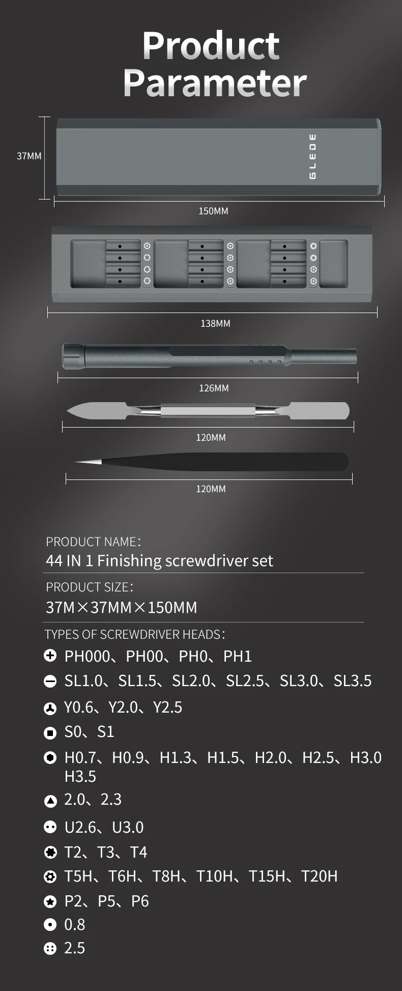 Torx:T2 T3 T4 TR5 TR6 TR7 TR8 TR10 TR15 TR20