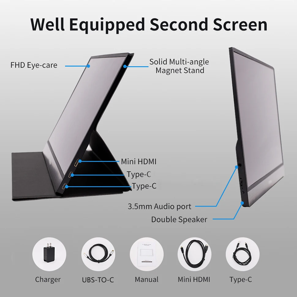 Портативный экран для mini HDMI, Type-c, позволяет легко подключаться к ноутбукам, ПК, телефонам, игровым устройствам и мыши, клавиатуре, идеально подходит для расширения экрана или игр в бизнес-поездках, путешествиях или домашних развлечений.